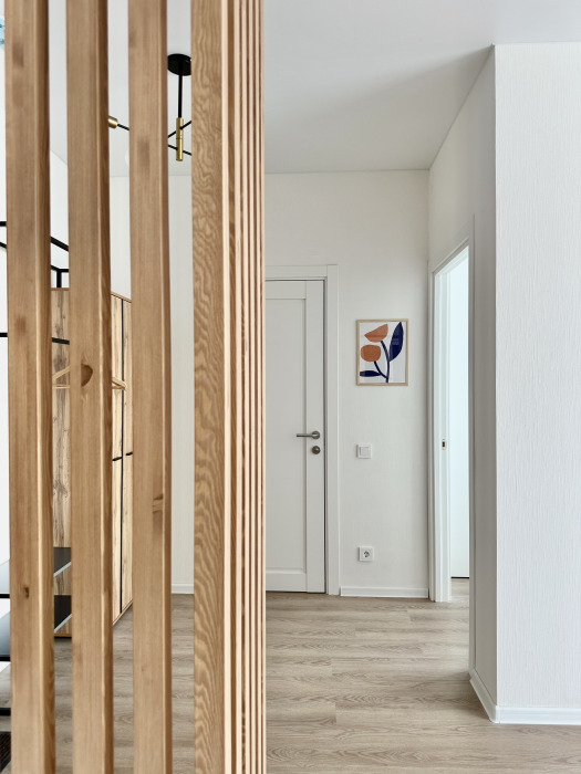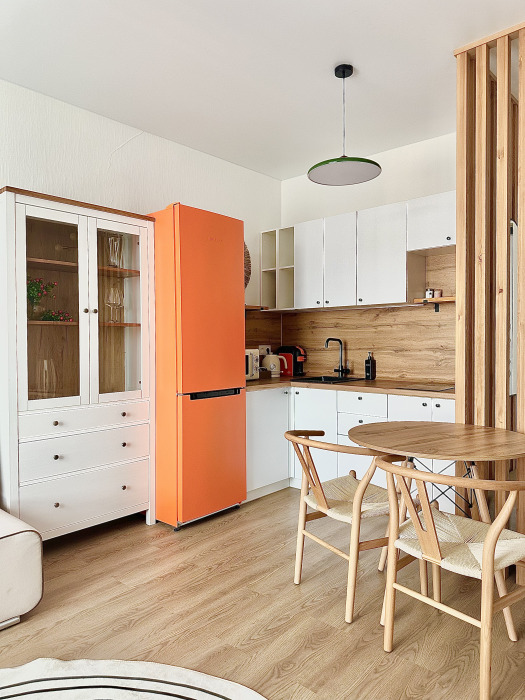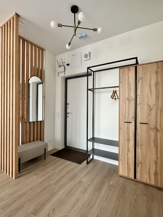 Смеситель на кухне - с встроенным фильтром для питьевой воды. Имеется мини-бар с напитками и закусками за дополнительную цену, а также совершенно бесплатная чайная станция. Зона прихожей отделена от гостиной реечной перегородкой; в прихожей - банкетка, зеркало и шкаф.
