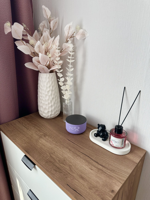 В гостиной имеется просторный раскладной диван, тумба, кофейный столик, а умная колонка дополнит Ваш досуг любимой музыкой.
