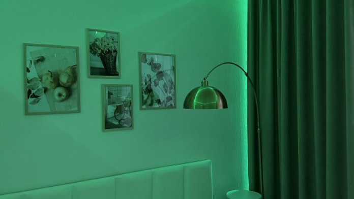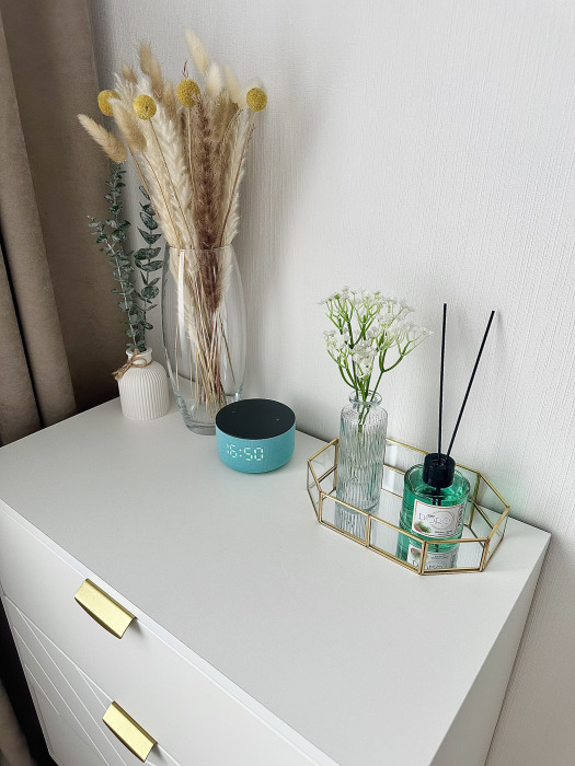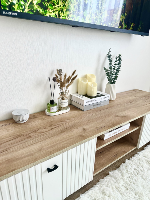 В гостиной имеется просторный раскладной диван, тумба, кофейный столик, а умная колонка дополнит Ваш досуг любимой музыкой.