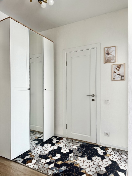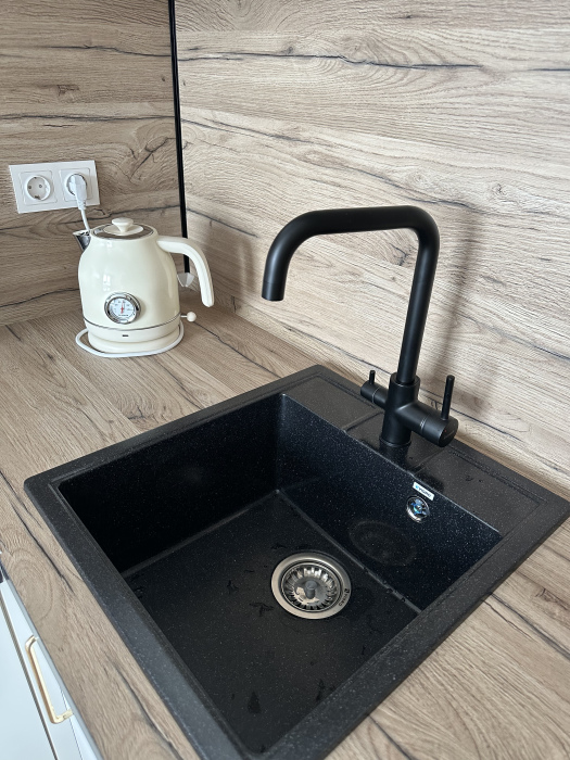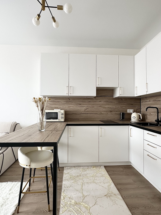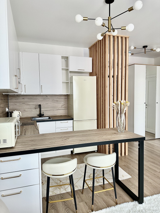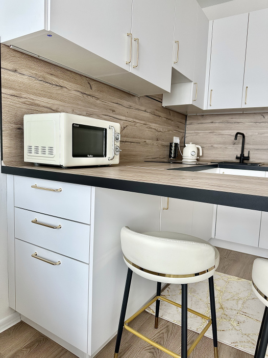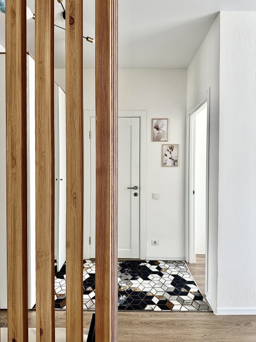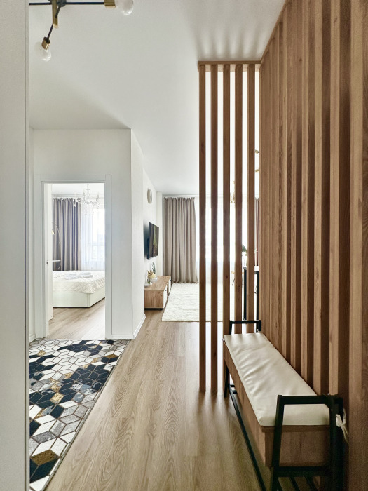 Смеситель на кухне - с встроенным фильтром для питьевой воды. Имеется мини-бар с напитками и закусками за дополнительную цену, а также совершенно бесплатная чайная станция. Зона прихожей отделена от гостиной реечной перегородкой; в прихожей - банкетка, зеркало и шкаф.