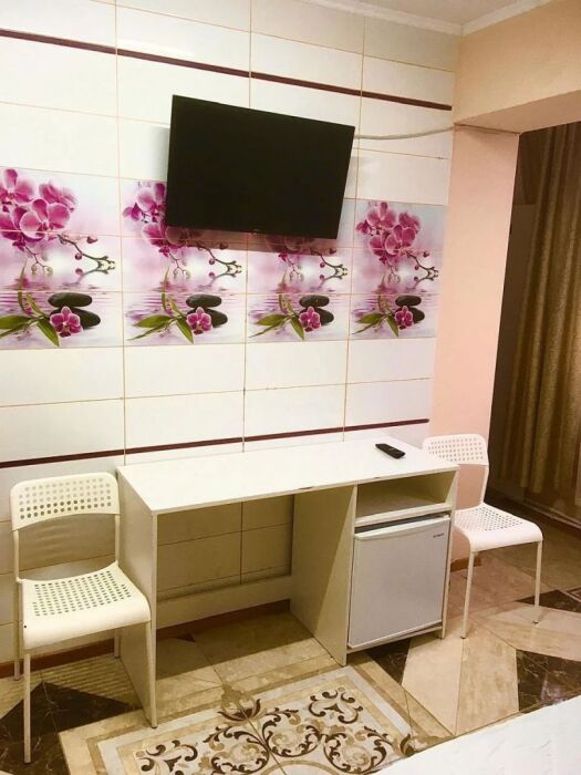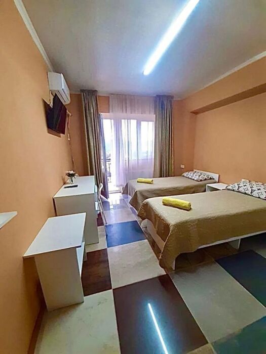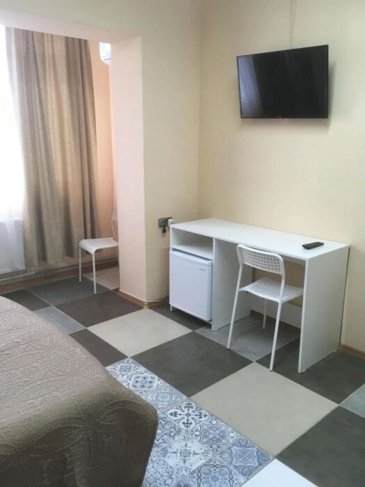 В номере: санузел, душ, кондиционер, телевизор холодильник, письменный стол.
