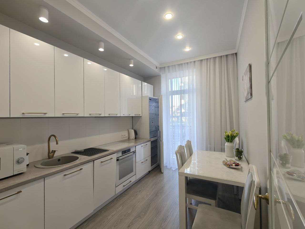 Кухня: индукционная плита, микроволновка, духовка, холодильник, полный набор посуды и столовые приборы.