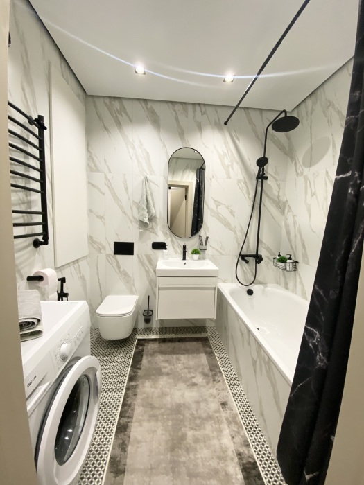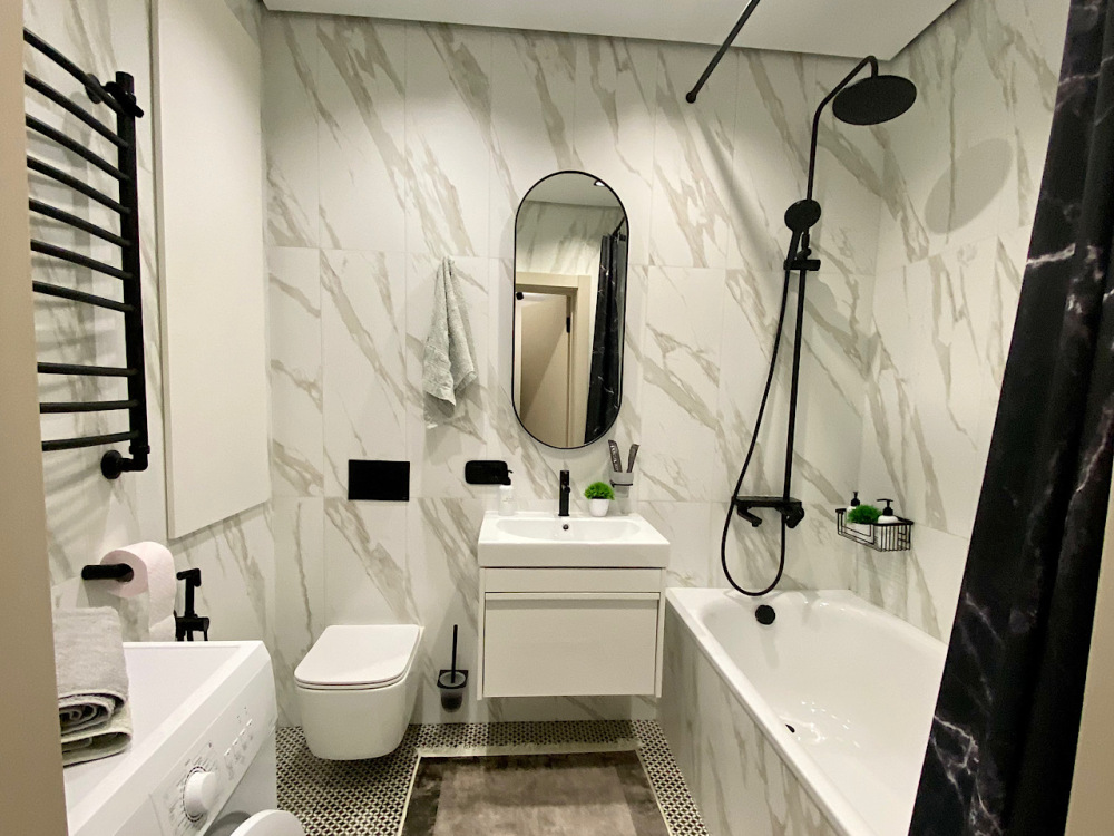Совмещенный санузел с ванной, на полу плитка с эффектом массажа ног.