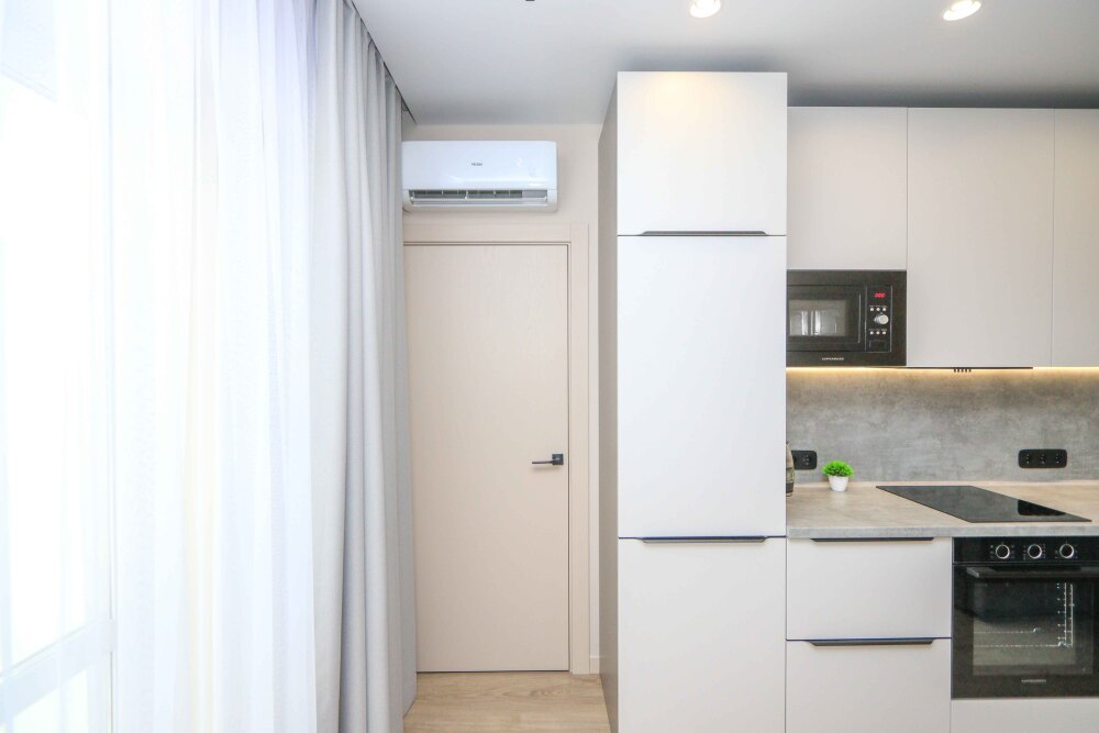 Установлена кухня со всей встроенной техникой (варочная поверхность, духовой шкаф, вытяжка, микроволновая печь, посудомоечная машина, встраиваемый холодильник, винный шкафчик), освещение кухонной поверхности с датчиком прикосновения/движения.