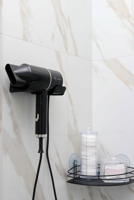 Стиральная машина, фен, утюг, гладильная доска, постельное бельё и полотенца.