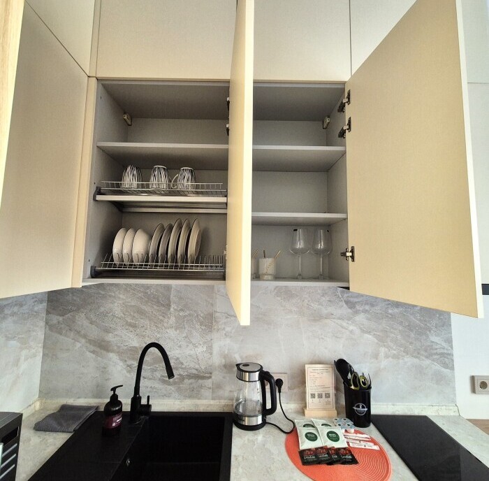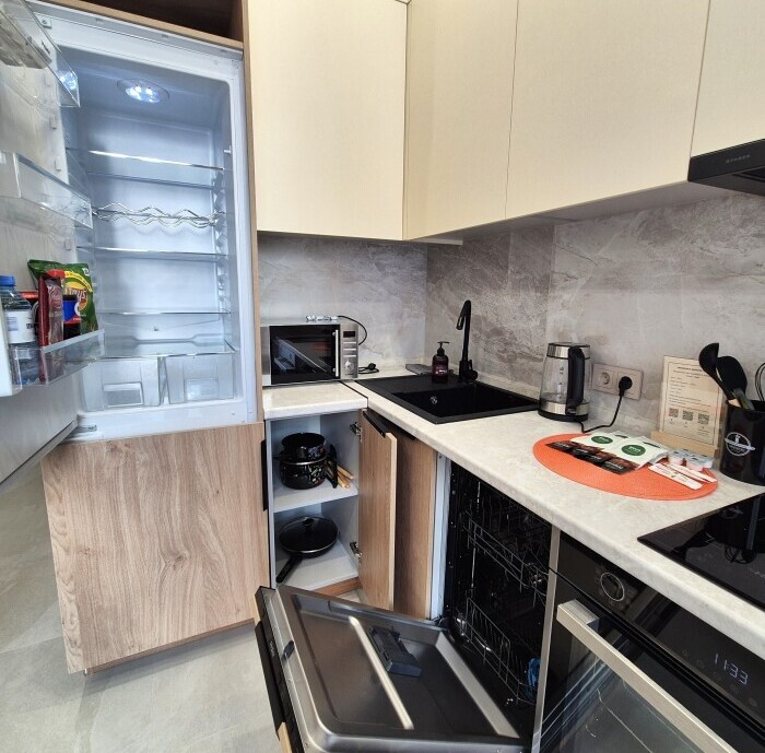 - Холодильник, плита, микроволновая печь, чайник, стиральная машина, посудомойка