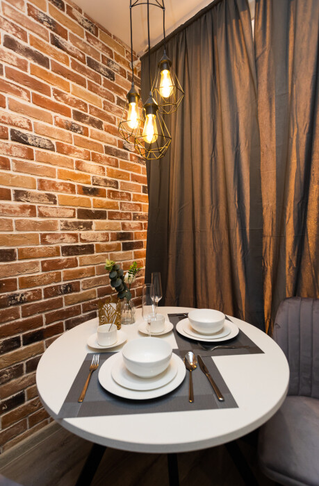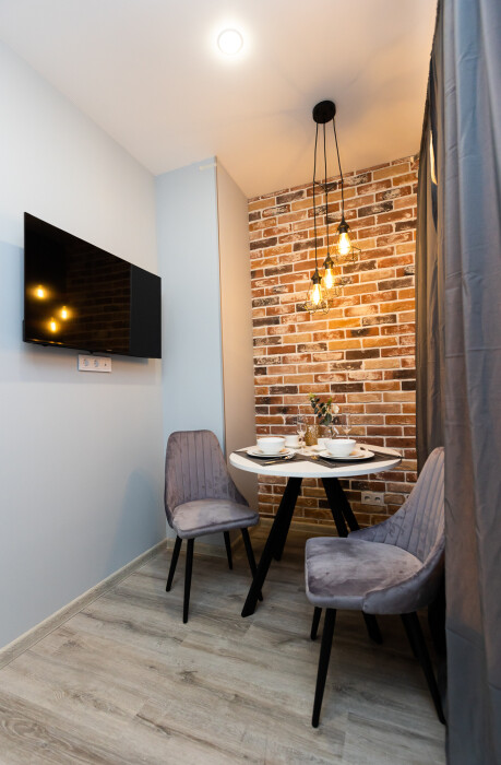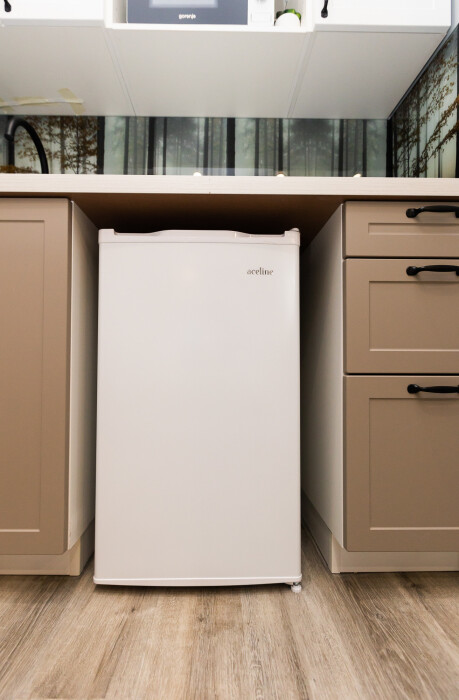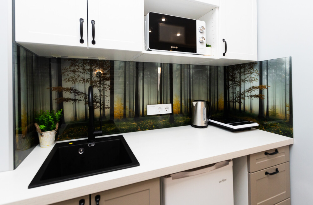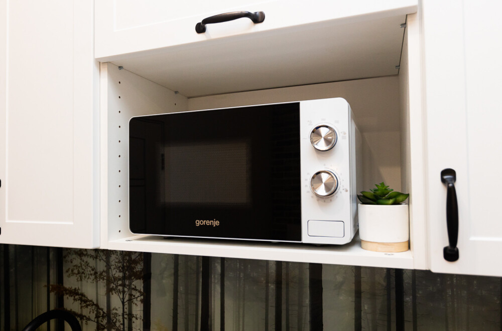 - Кухня с холодильником, плитой, микроволновкой, чайником и посудой