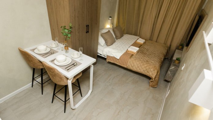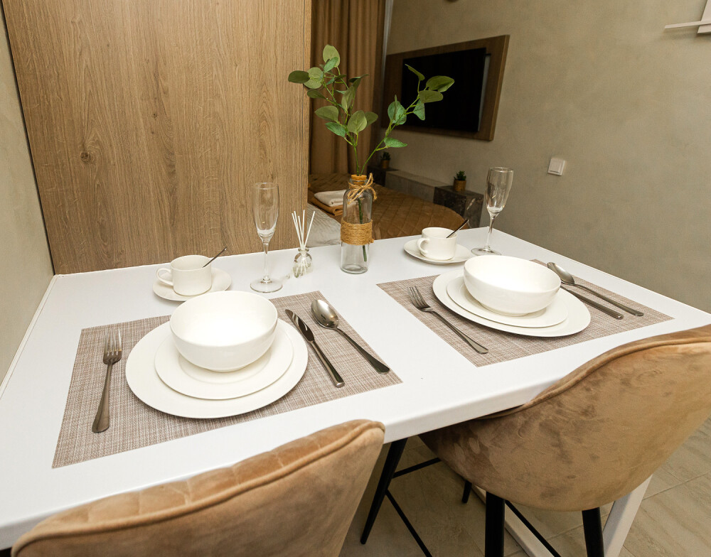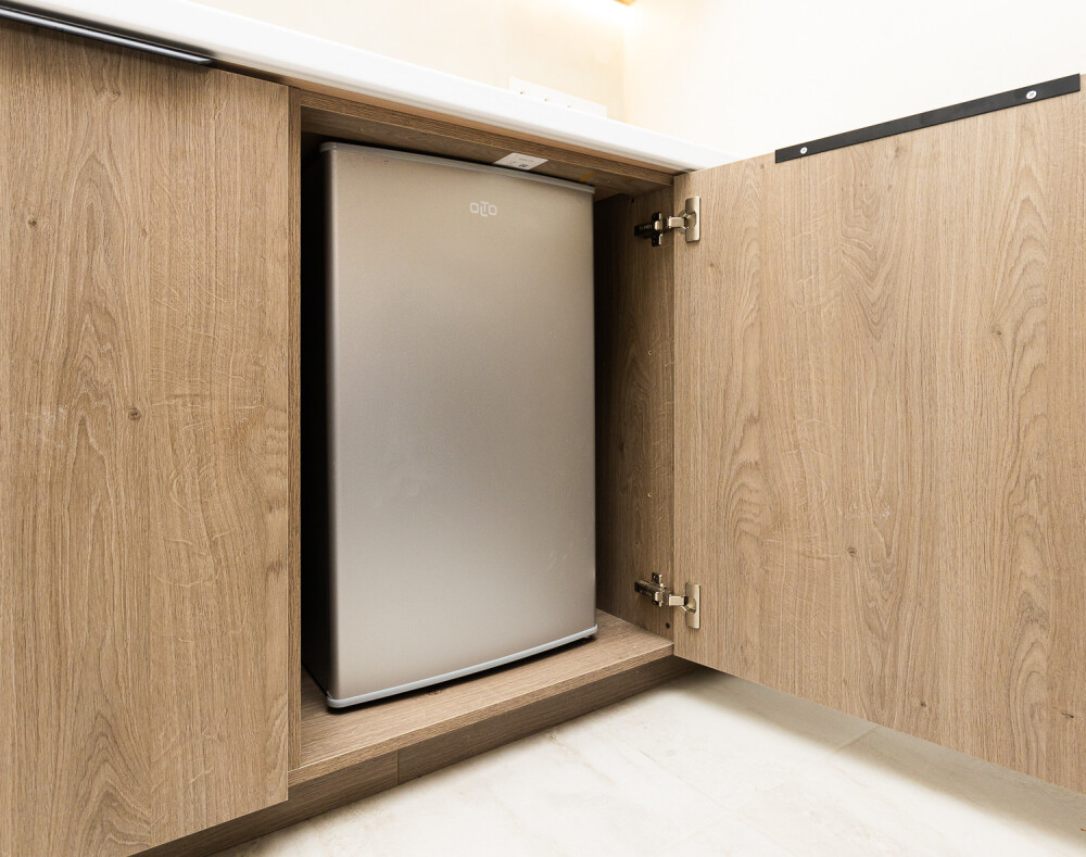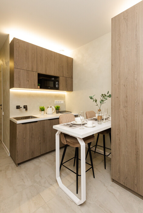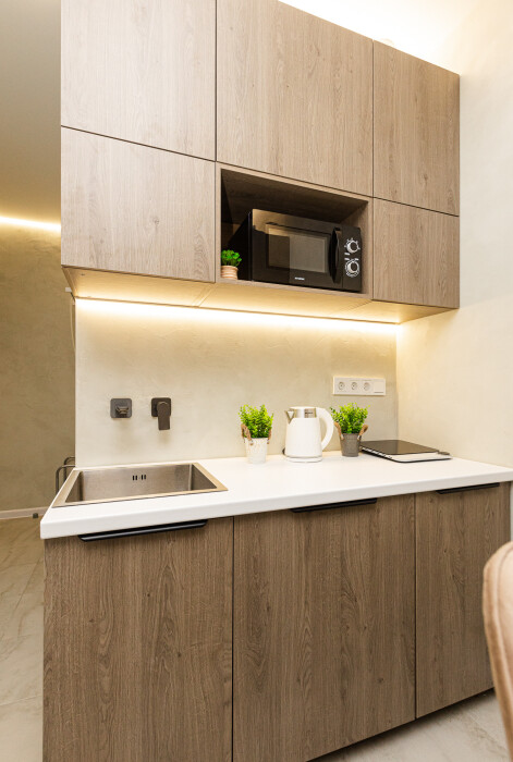 - Кухня с холодильником, плитой, микроволновкой, чайником и посудой
