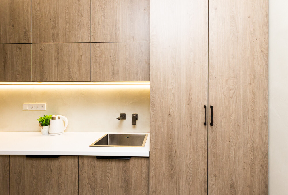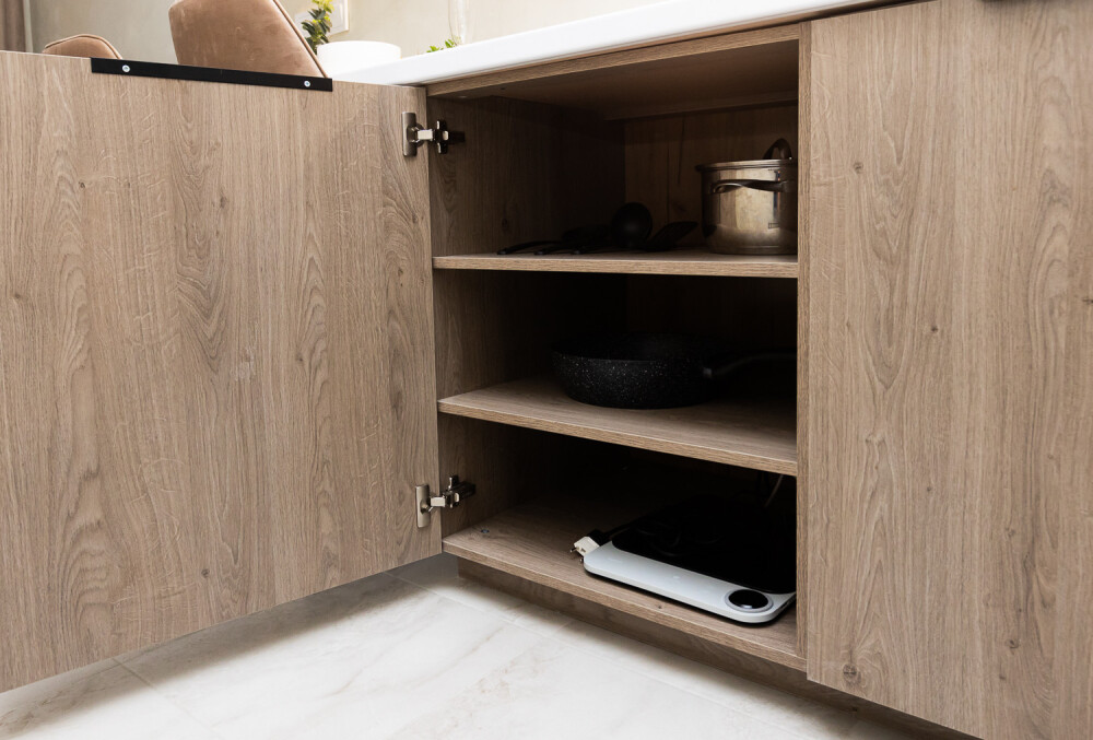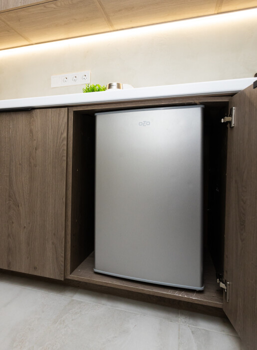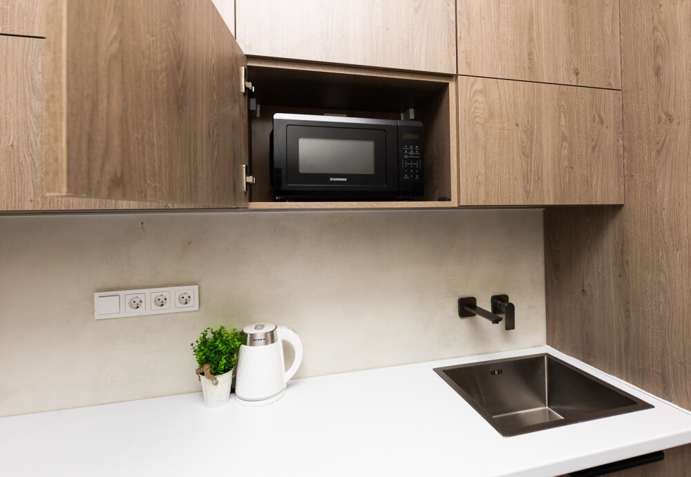 - Кухня с холодильником, плитой, микроволновкой, чайником и посудой