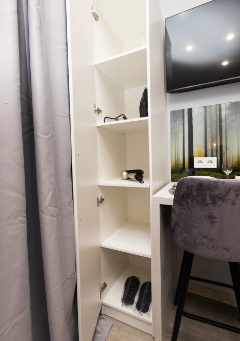 - Кухня с холодильником, плитой, микроволновкой, чайником и посудой