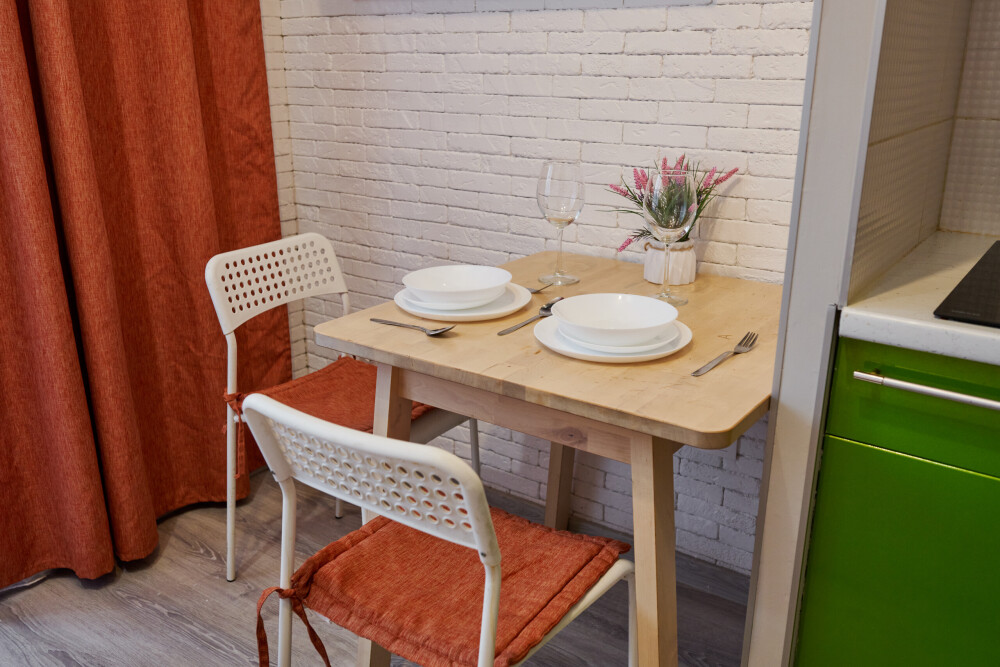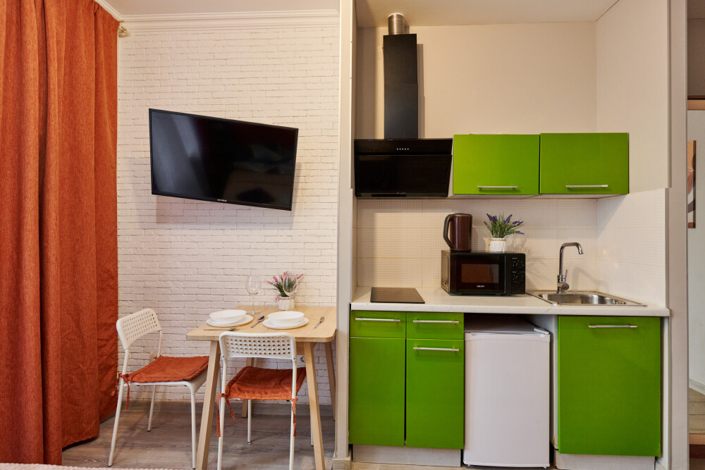 - Кухня с холодильником, плитой, микроволновкой, чайником и посудой.