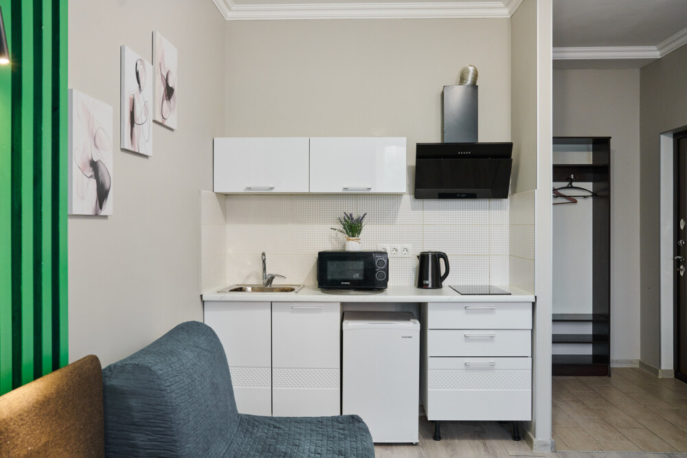 - Кухня с холодильником, плитой, микроволновкой, чайником и посудой.