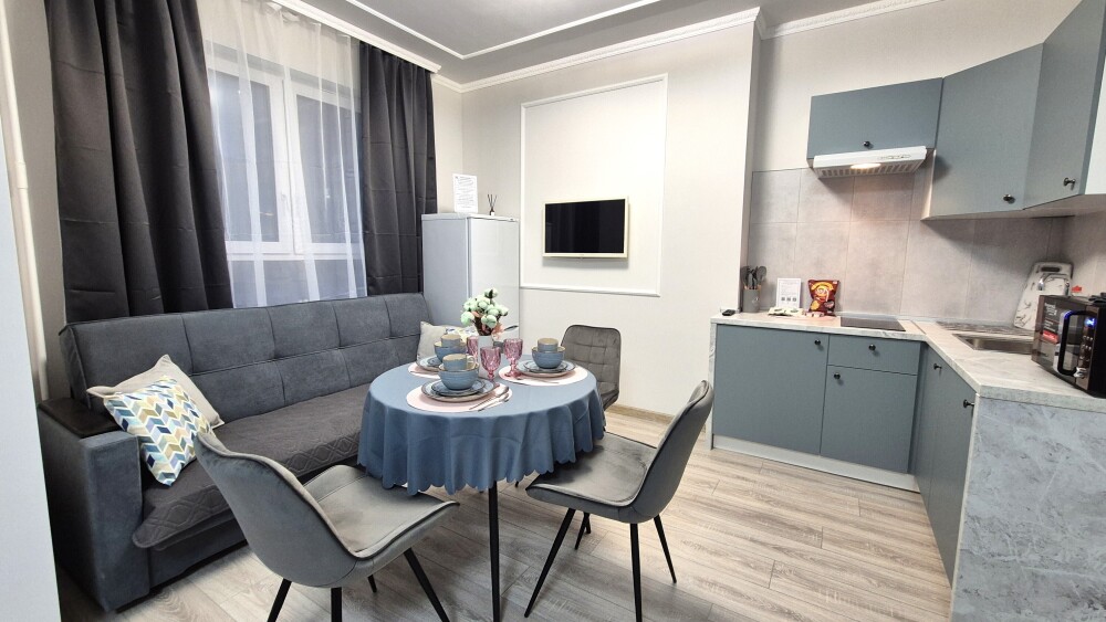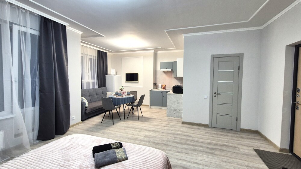 Просторная студия со свежим и качественным ремонтом в микрорайоне Новое Пушкино с балконом. Большая кухонная зона гостиная, балкон, телевизор Смарт. Два раздельных спальных места.