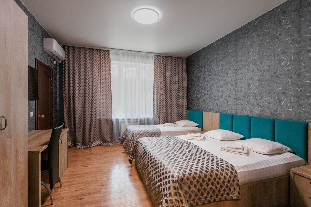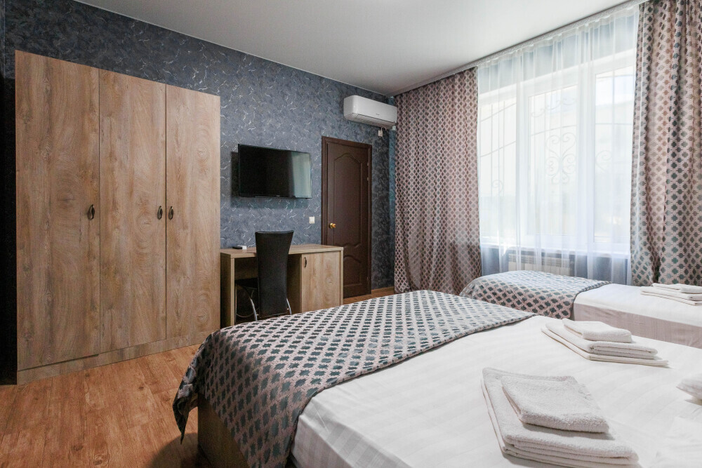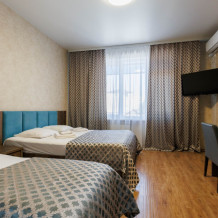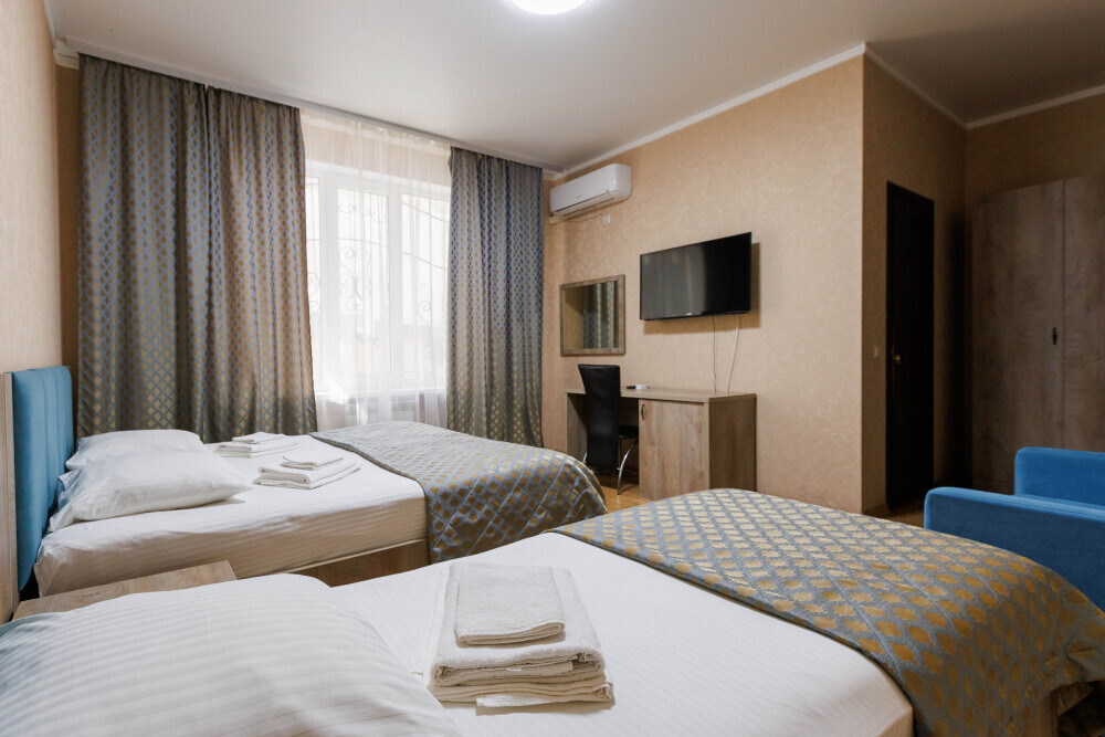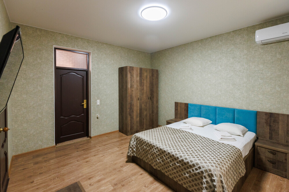 Двуспальная и односпальная кровати обеспечат Вам отличный сон и отдых после активного дня. Кондиционер, холодильник, ЖК телевизор и санузел с душем обеспечат Ваше удобство.