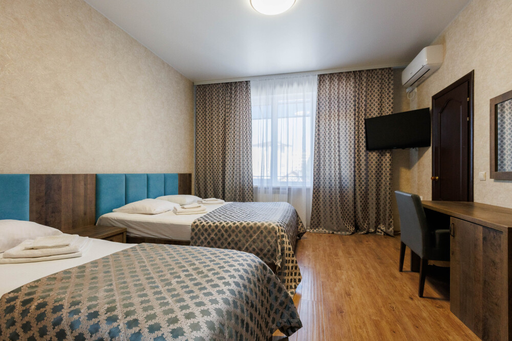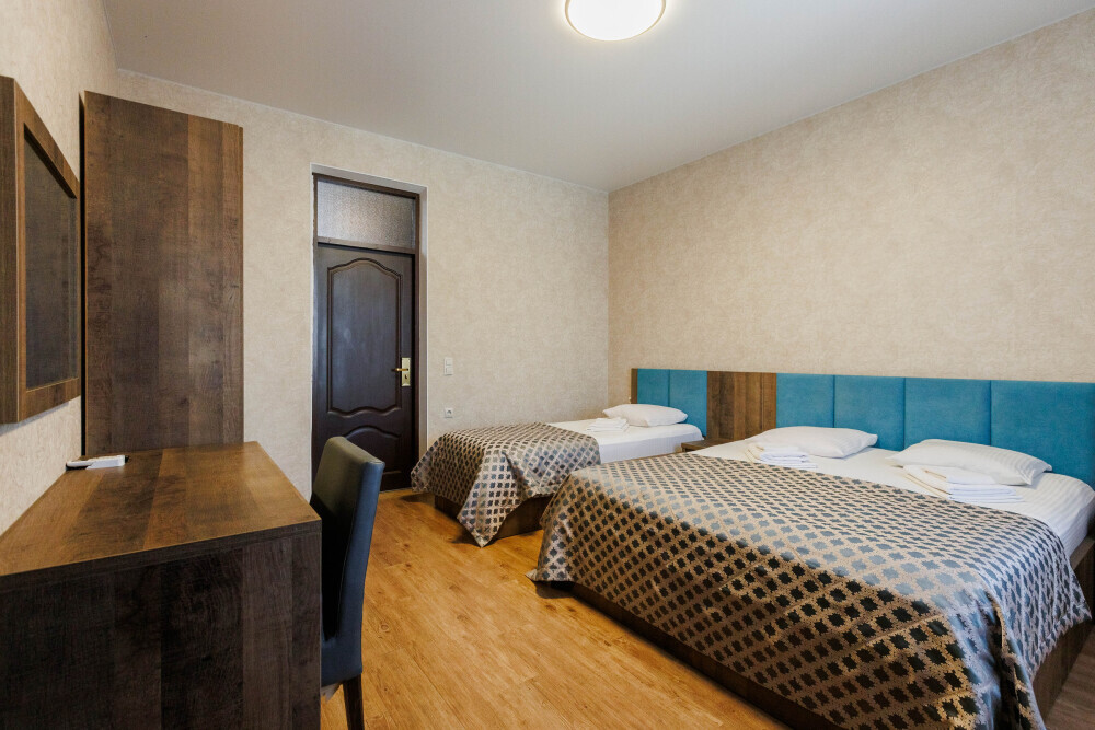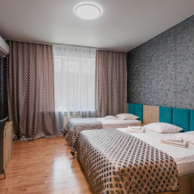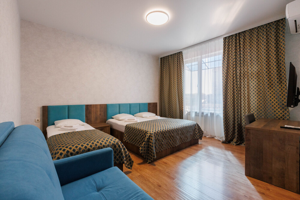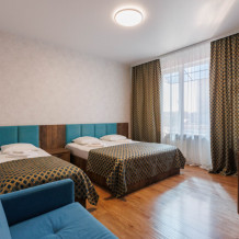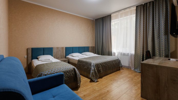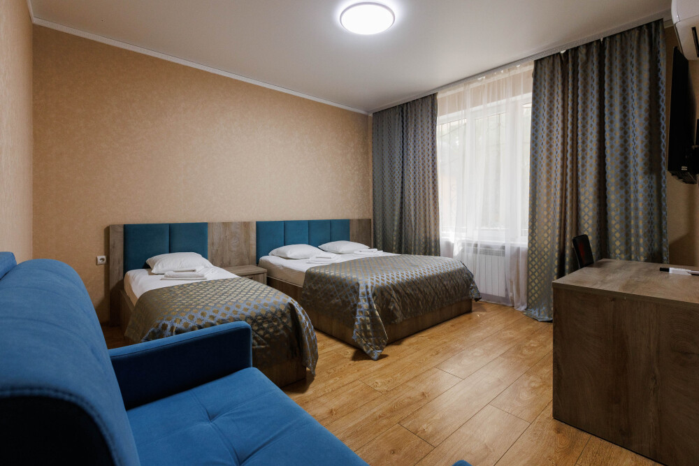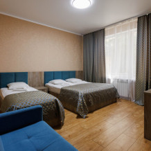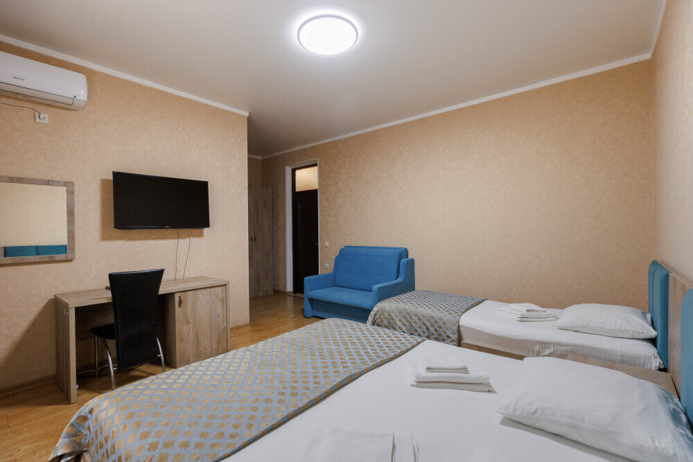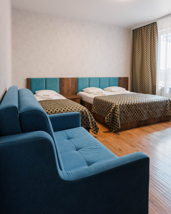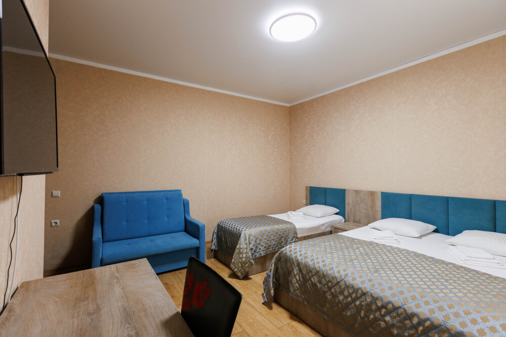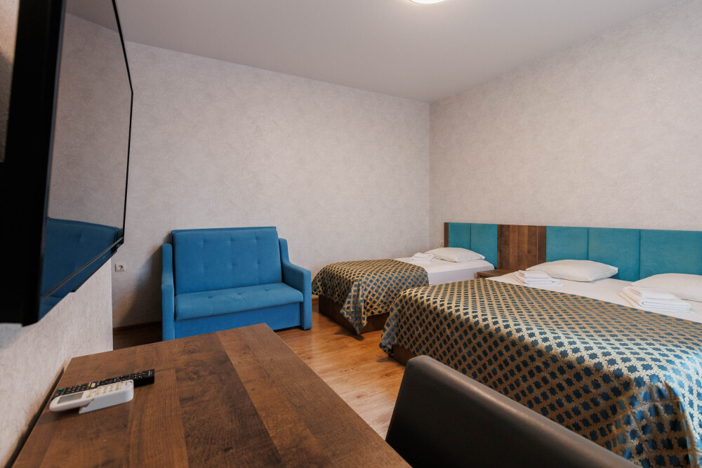 Двуспальная и две односпальные кровати обеспечат Вам отличный сон и отдых после активного дня. Кондиционер, холодильник, ЖК телевизор и санузел с душем обеспечат Ваше удобство.