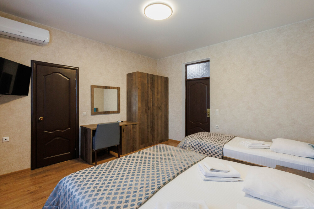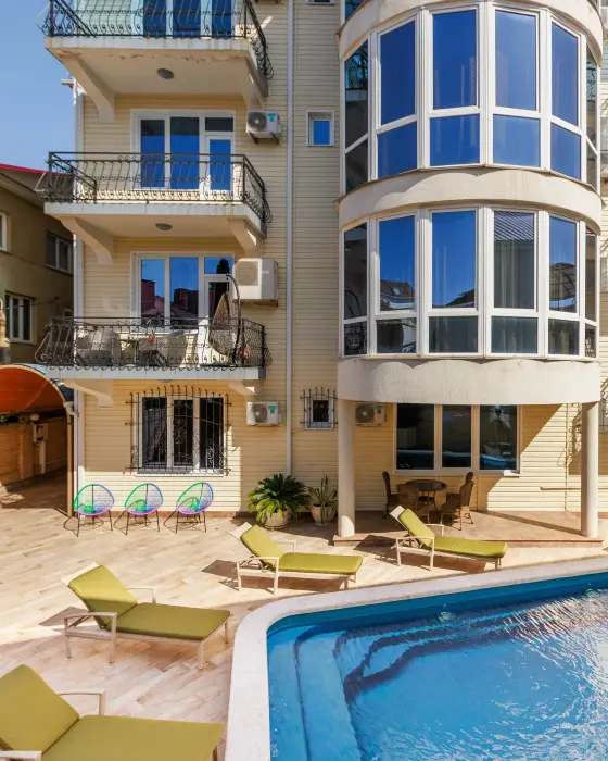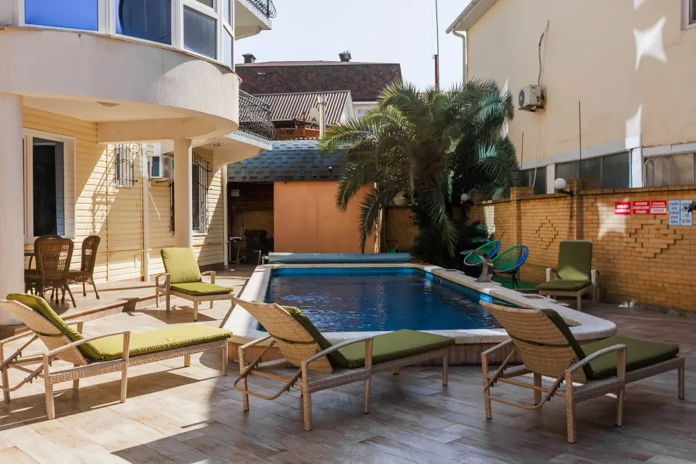 Уютные номера со всем необходимым подойдут для отдыха вдвоём, с семьёй или небольшой компанией. На территории гостевого дома есть подогреваемый бассейн, а рядом находятся рынок, торговые точки, прогулочные зоны и всё, что нужно для удобного и приятного отдыха в Адлере.