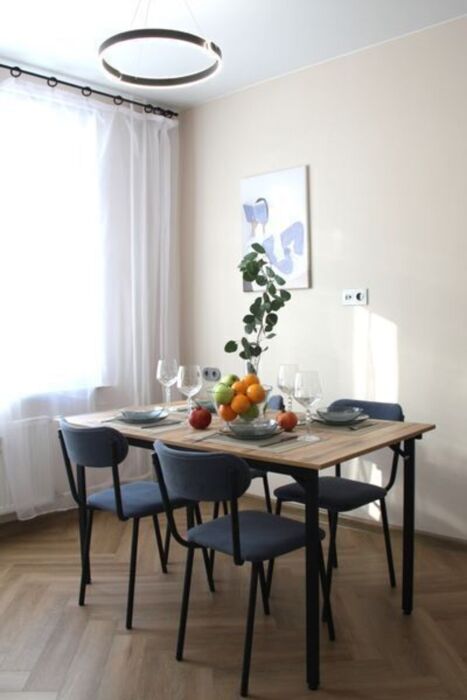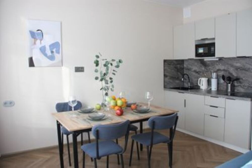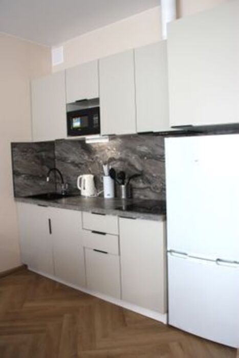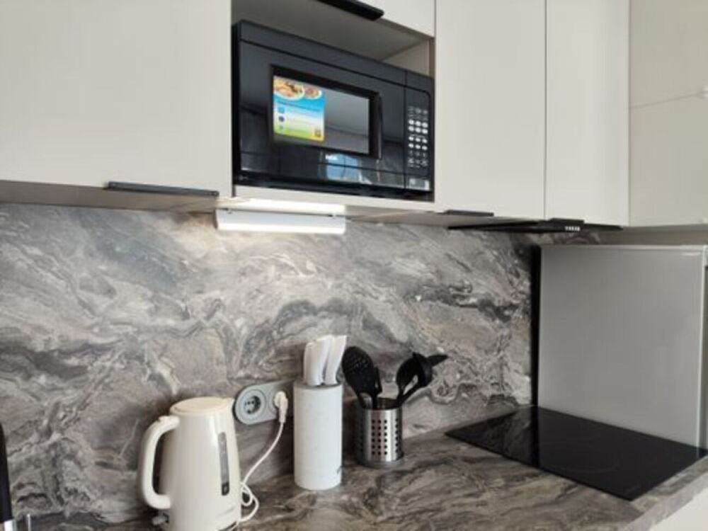 - Кухня оснащена необходимой техникой (посудомоечная машина, микроволновая печь, электроплита, холодильник), а также полным набором посуды и кухонных принадлежностей для приготовления и красивой сервировки еды.