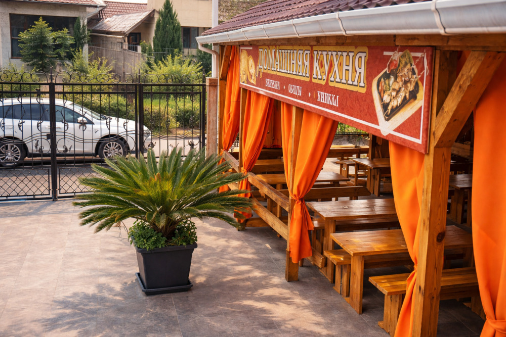 Для тех, кто не хочет готовить самостоятельно, в гостевом доме работает уютная столовая с приятными и доступными ценами, где можно вкусно и сытно поесть в любое время дня.