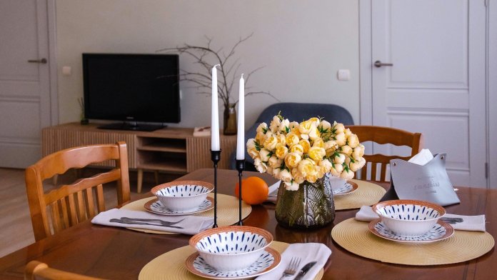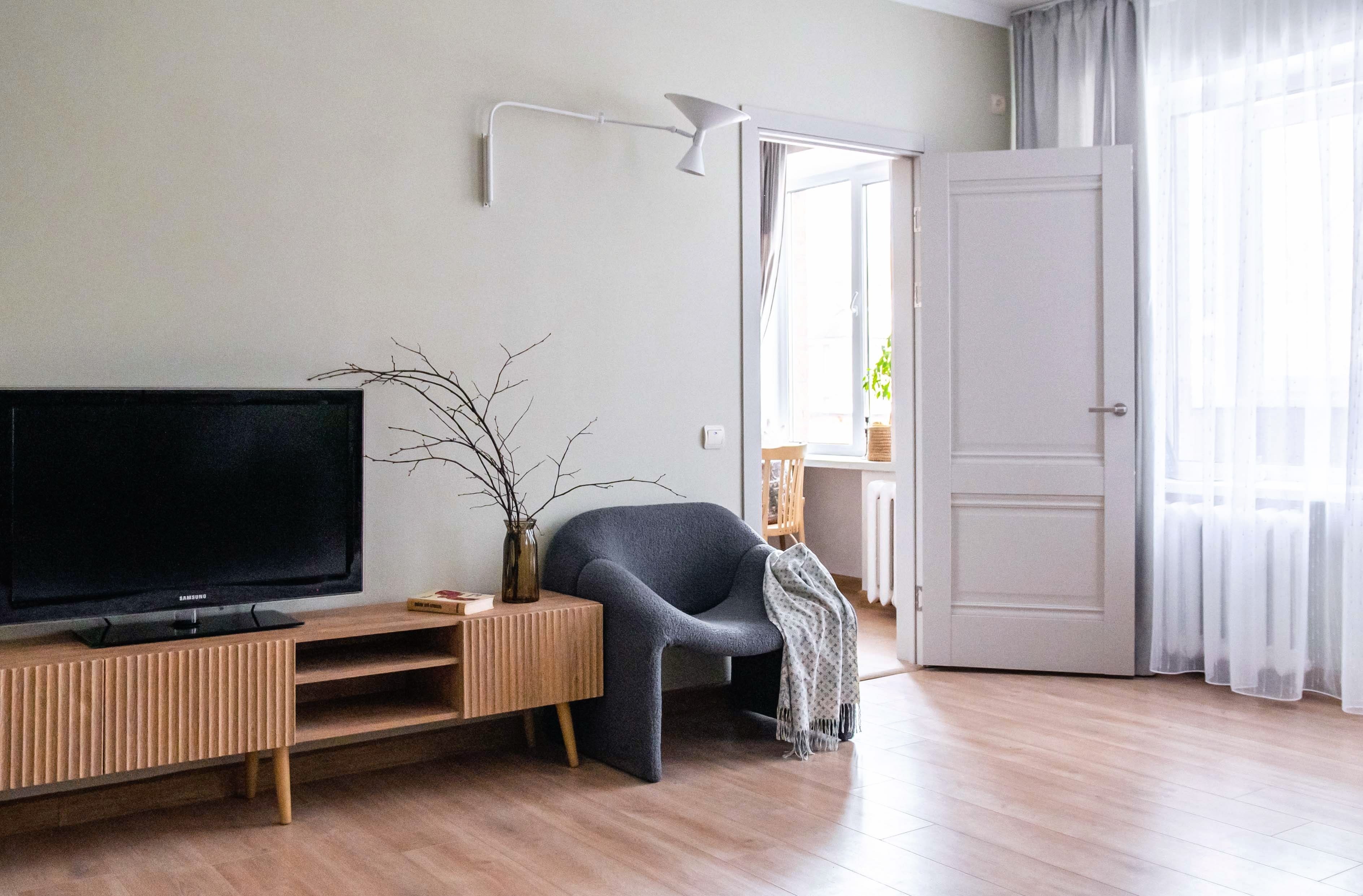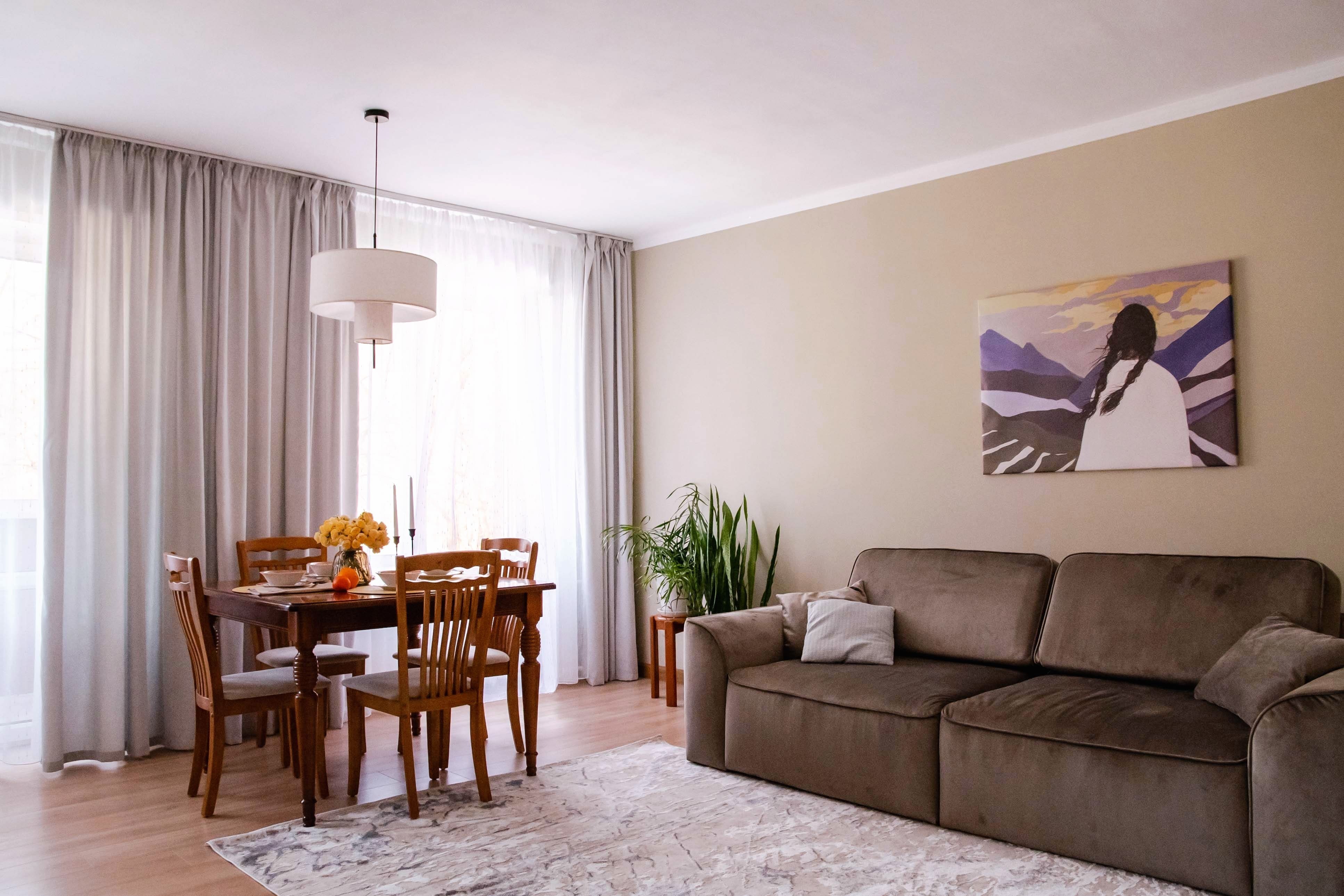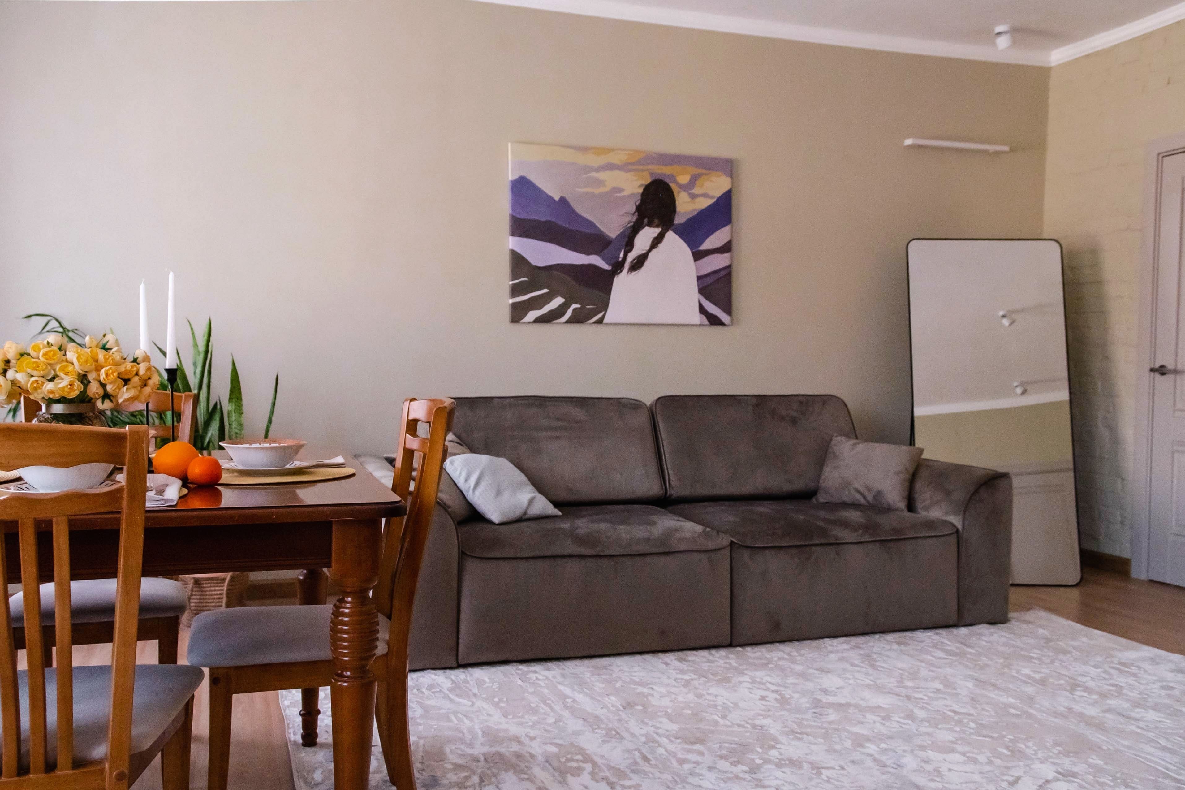 Комфортные условия для проживания и отдыха: уютная стильная гостиная со столовой зоной и большими окнами, отдельная спальня, оборудованная кухня.