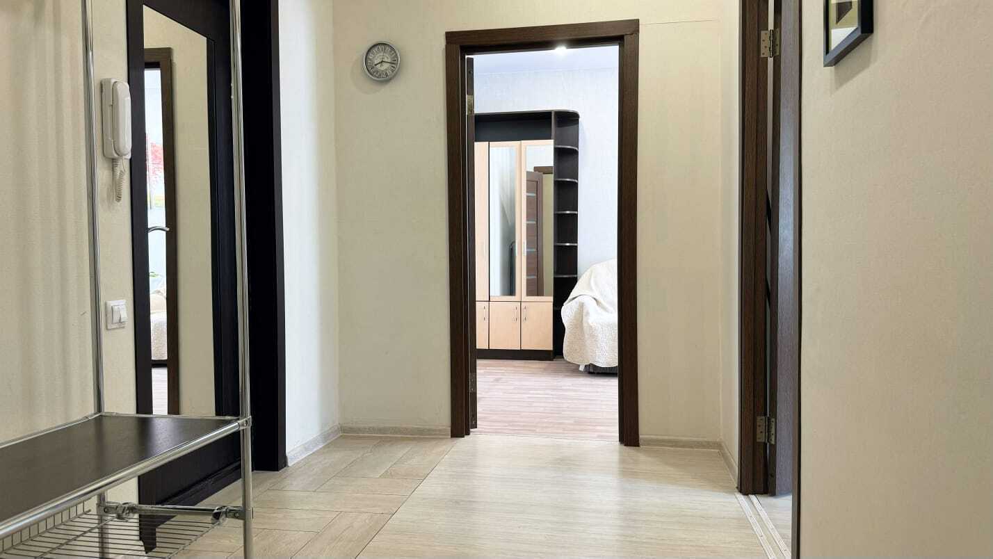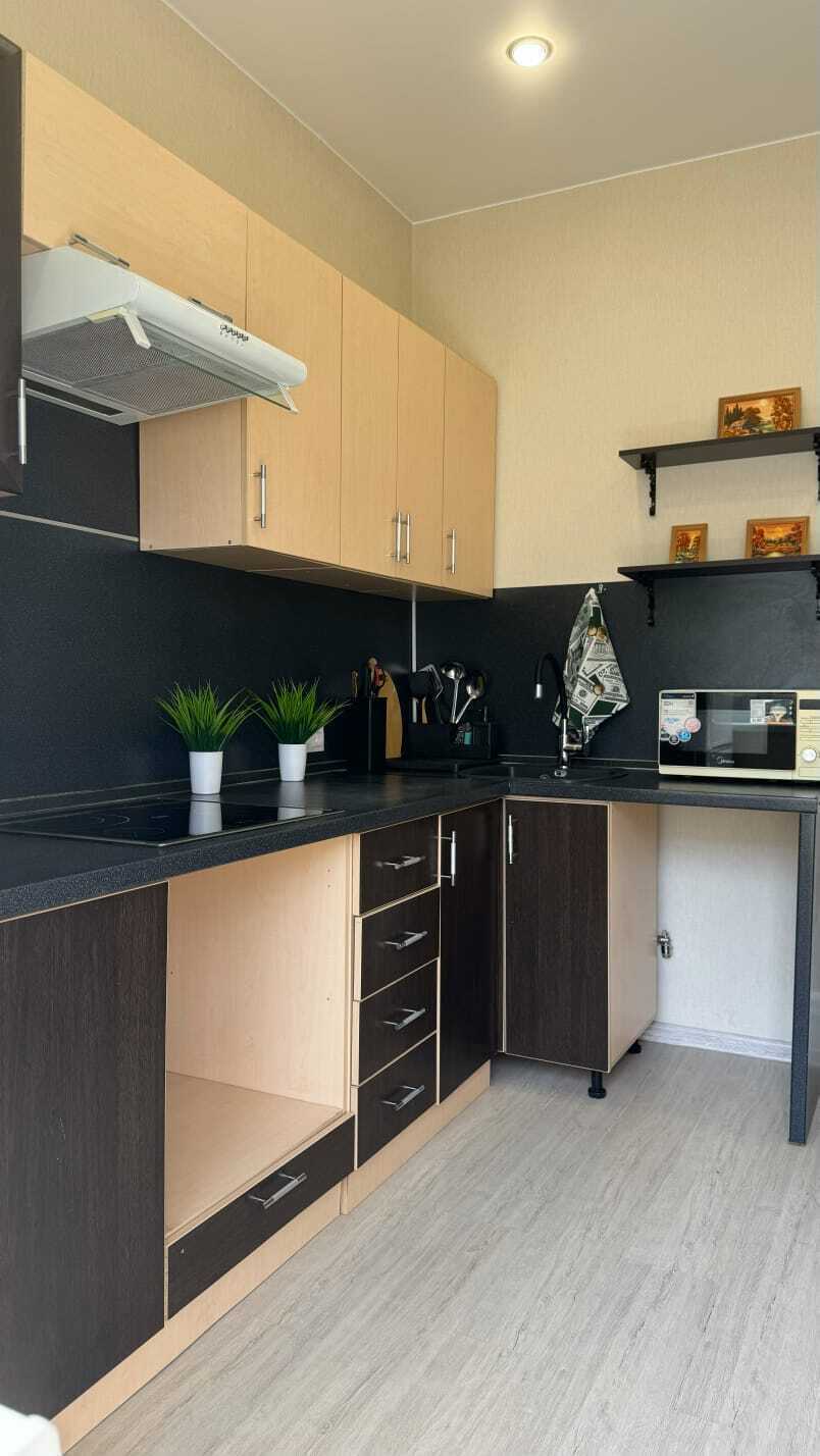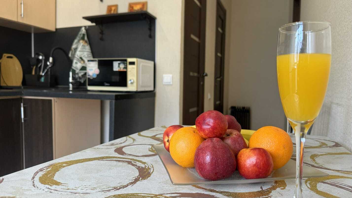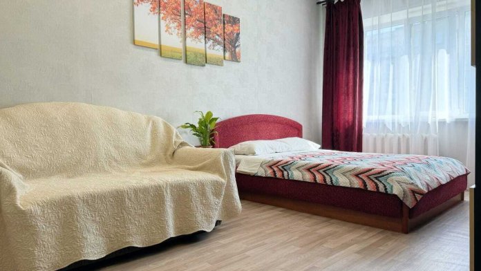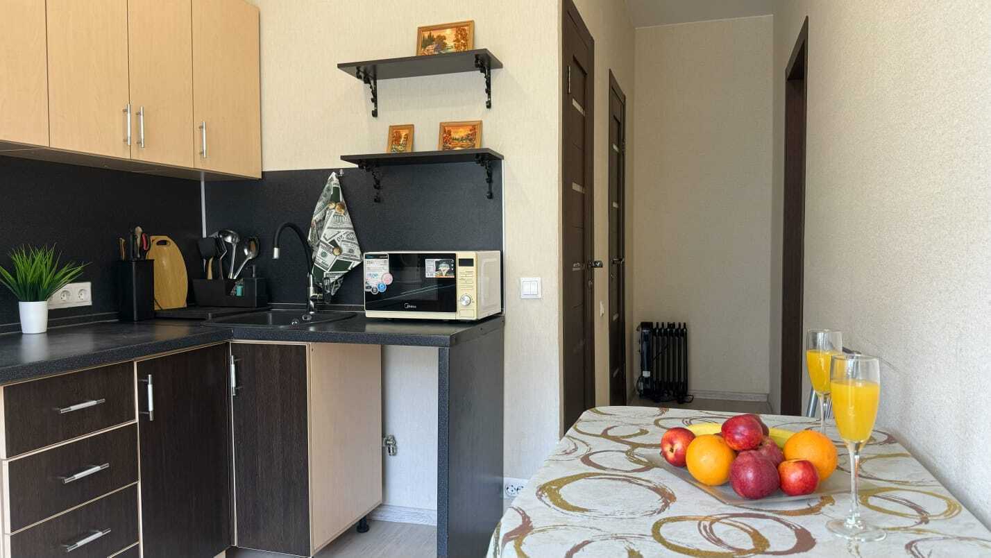 В квартире есть всё необходимое для комфортного проживания. Для Вашего удобства в каждой комнате установлены ТВ. На окнах плотные занавески, не пропускающие свет.
