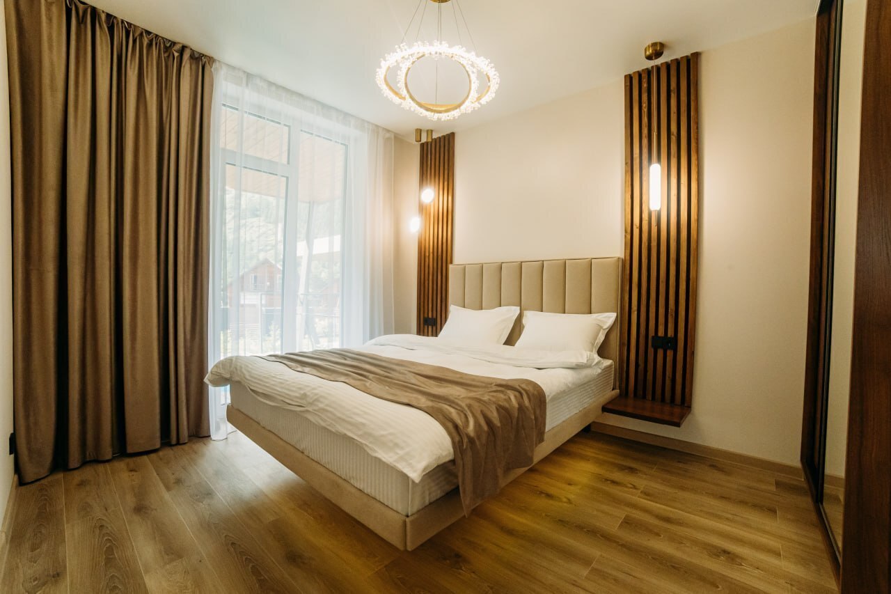 В доме: просторная гостиная с кухонной зоной, 2 спальни с двуспальными кроватями, ванная комната. У каждого дома большая терраса с уличной мебелью, а так же индивидуальная купель.