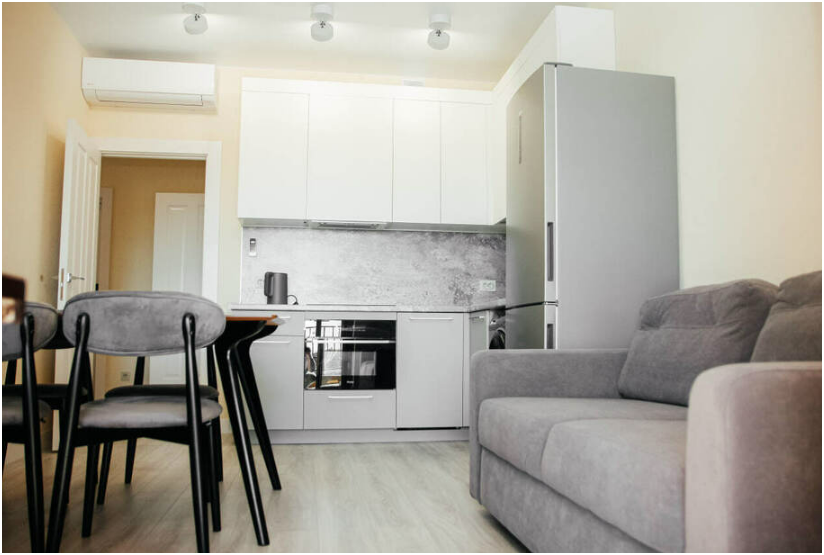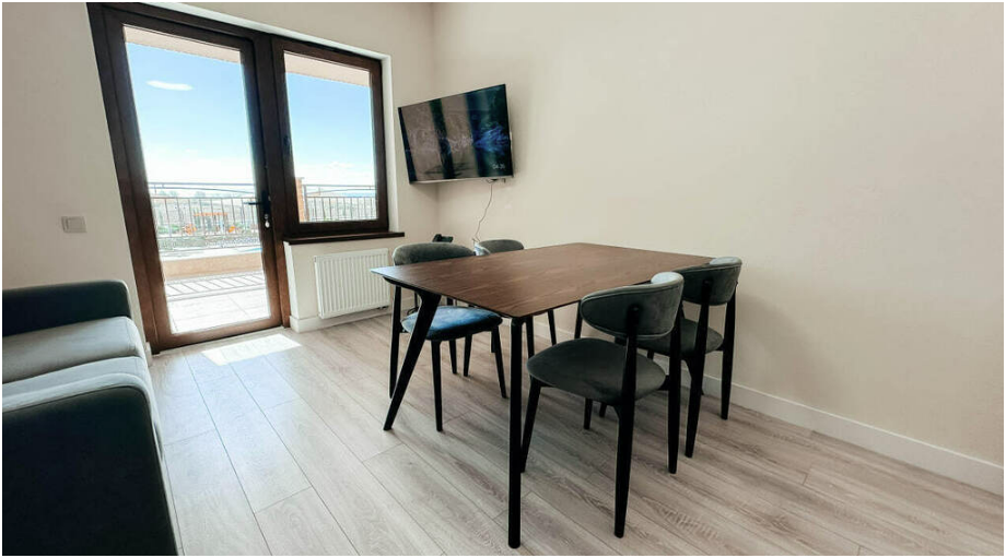 кухня-гостиная: раскладной диван, ТВ, кондиционер, выход на террасу.