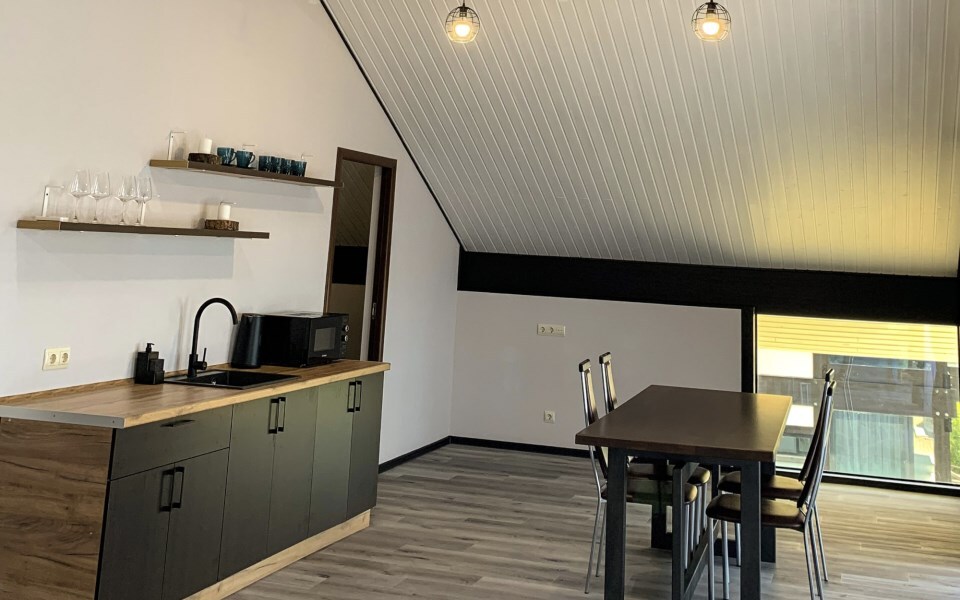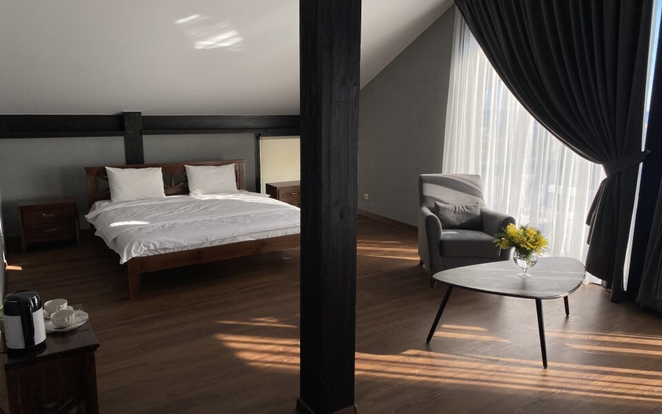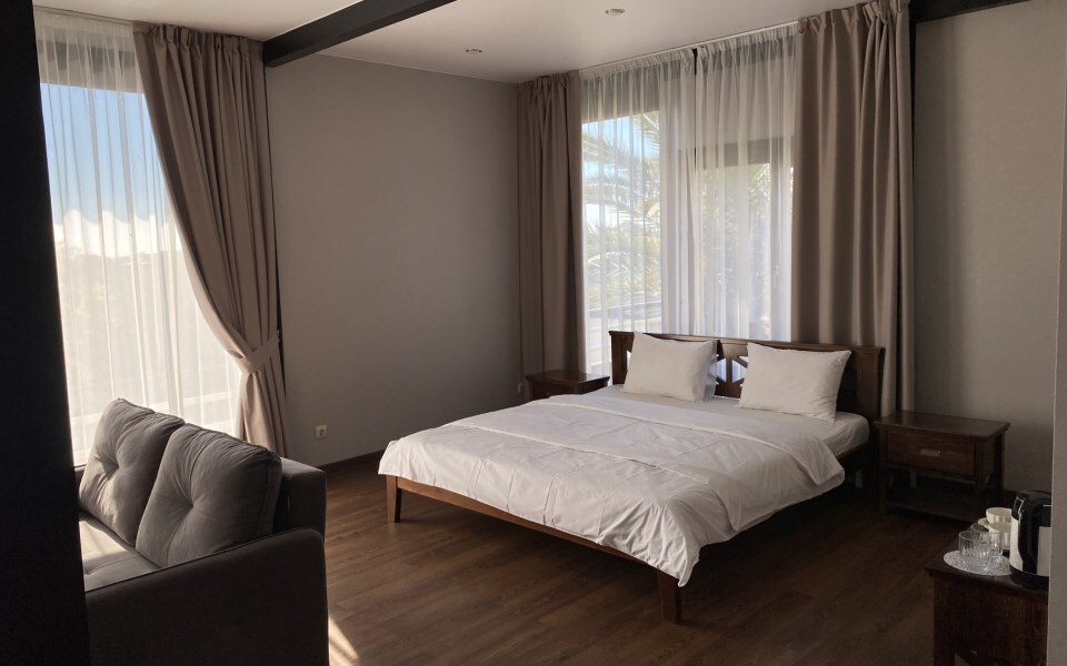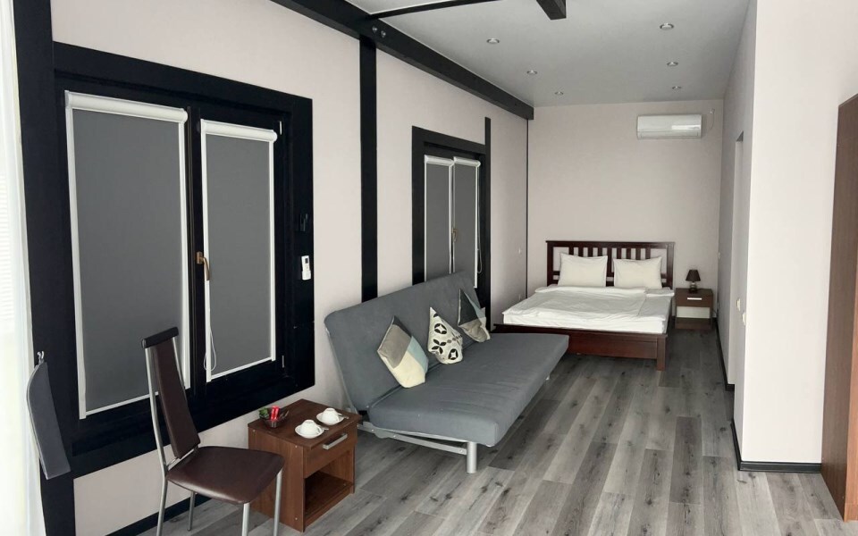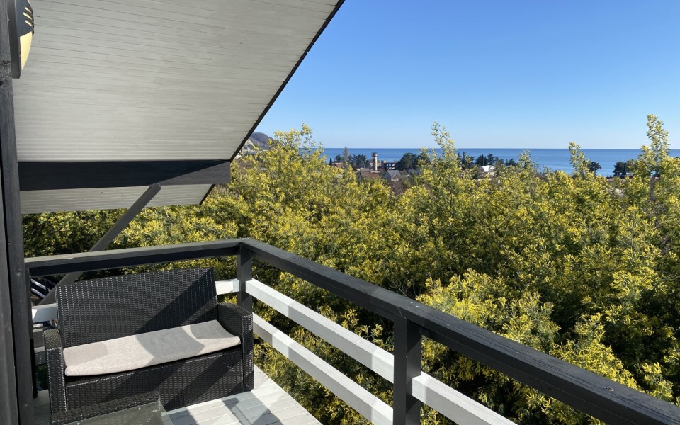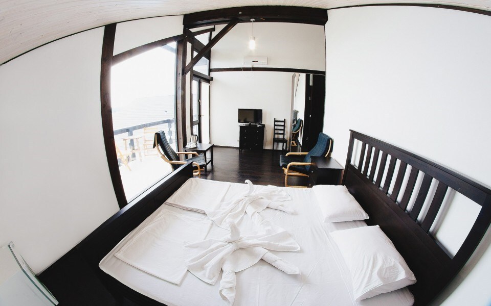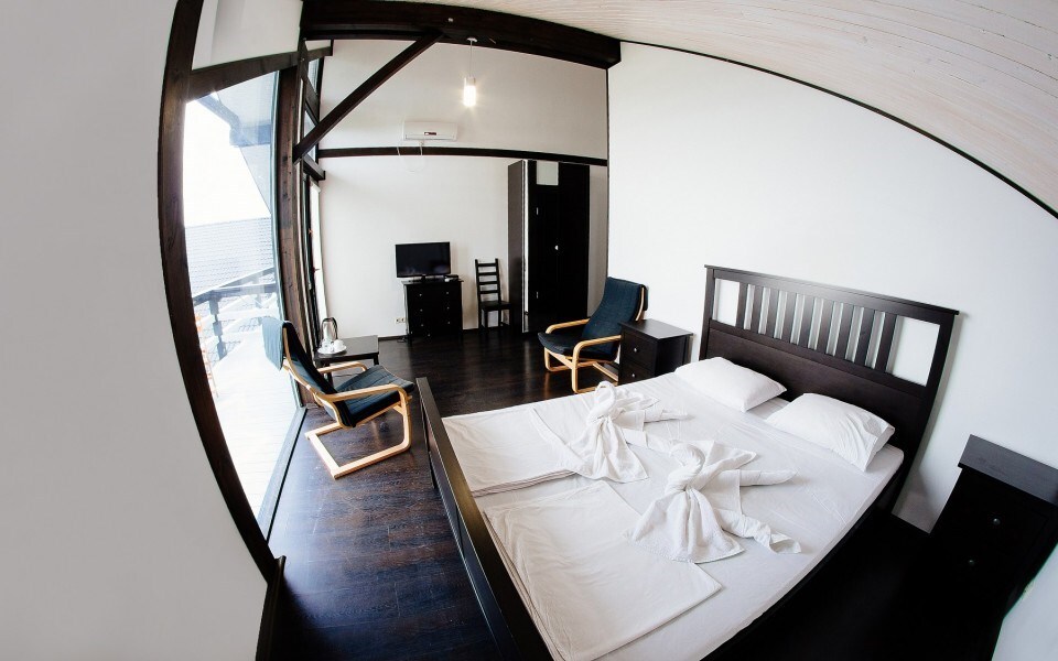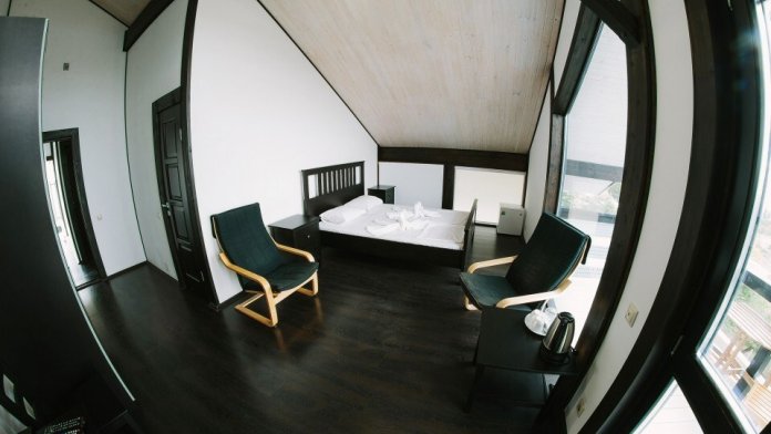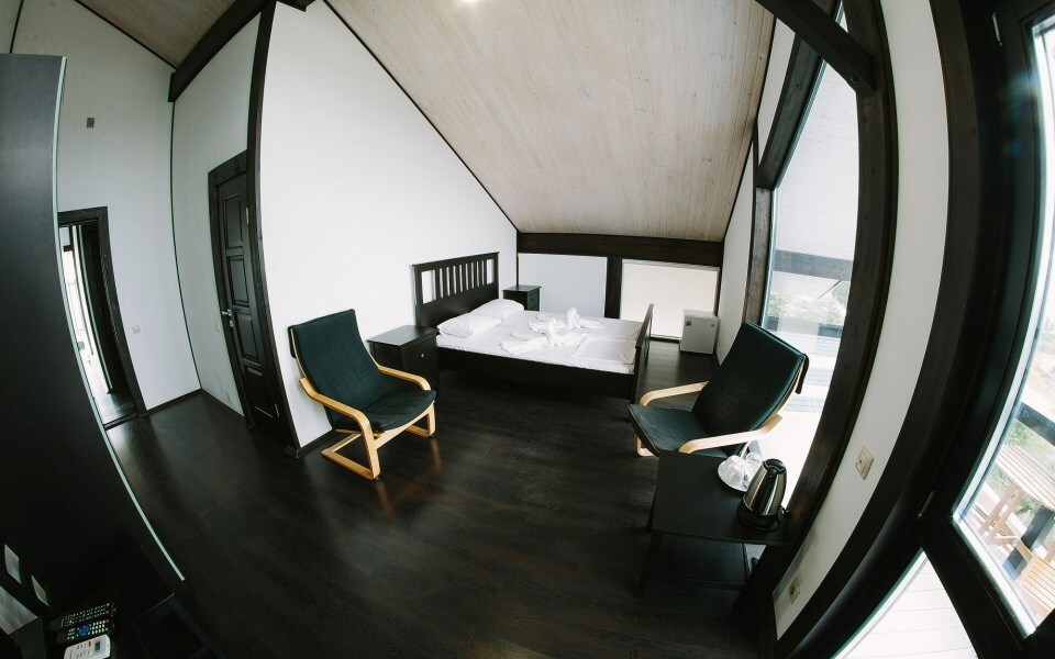 Живописное расположение у подножья гор позволяет сполна насладиться уединением в тихом местечке Абхазии. Панорамные окна отеля открывают всю красоту окружающей природы. На территории отеля находится 4 комфортабельных двухэтажных дома из бруса в стиле фахверк. Отдельно расположено кафе с просторной верандой и видом на море.