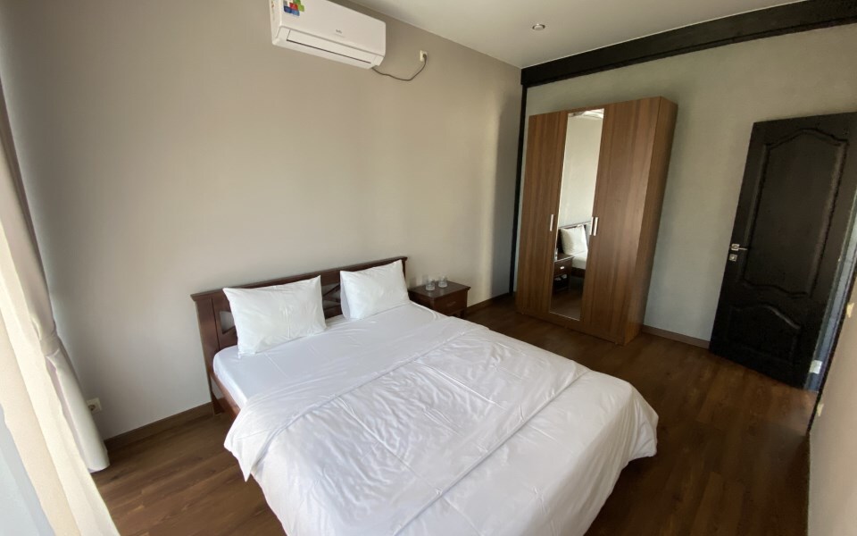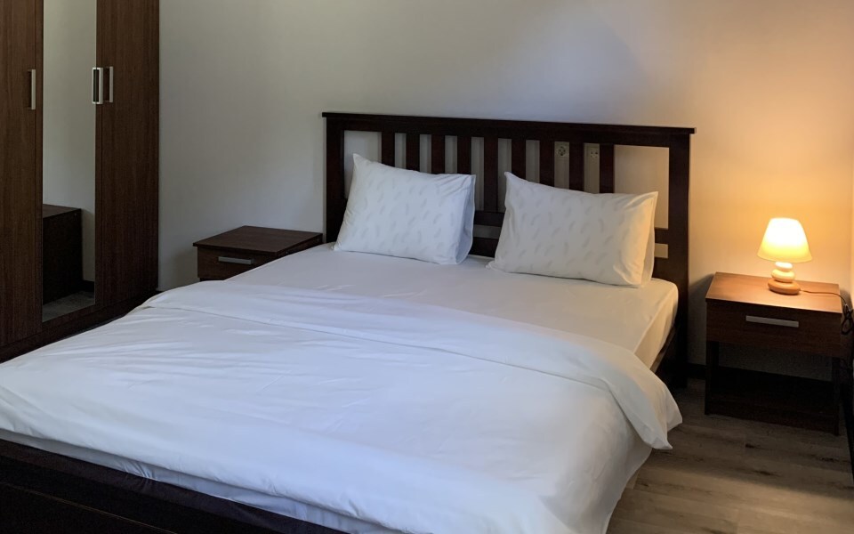 В номере двуспальная кровать и раскладной диван/раскладушка.