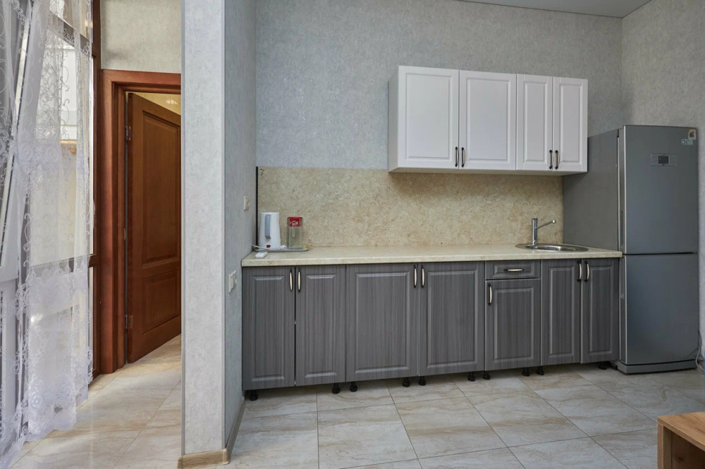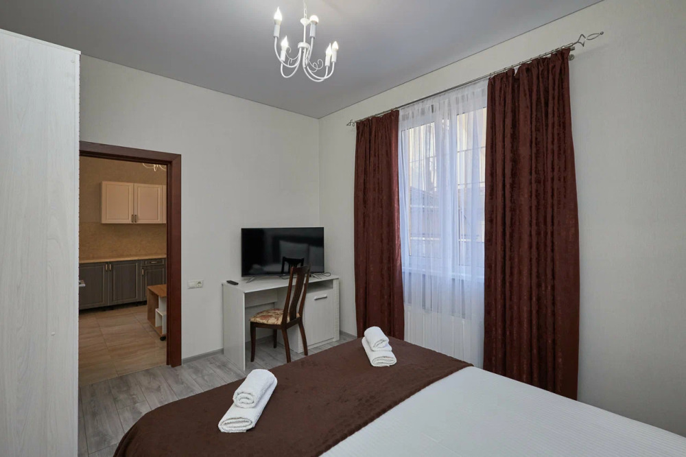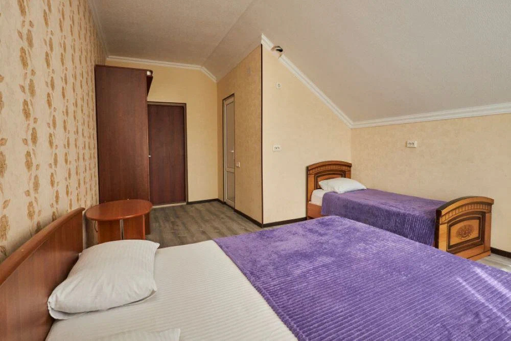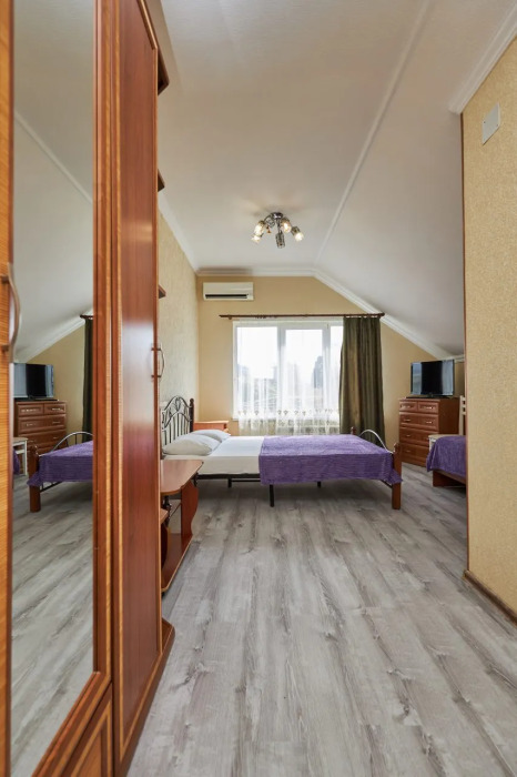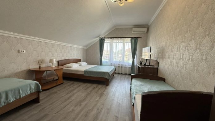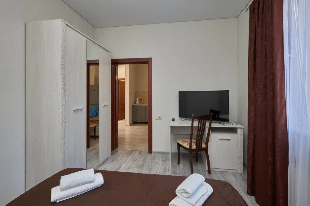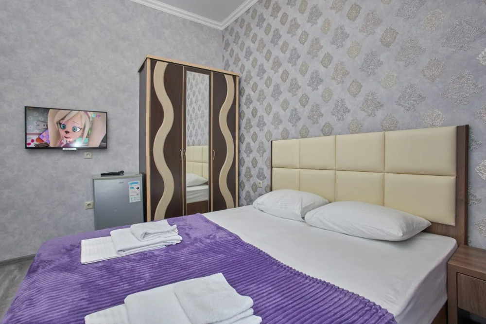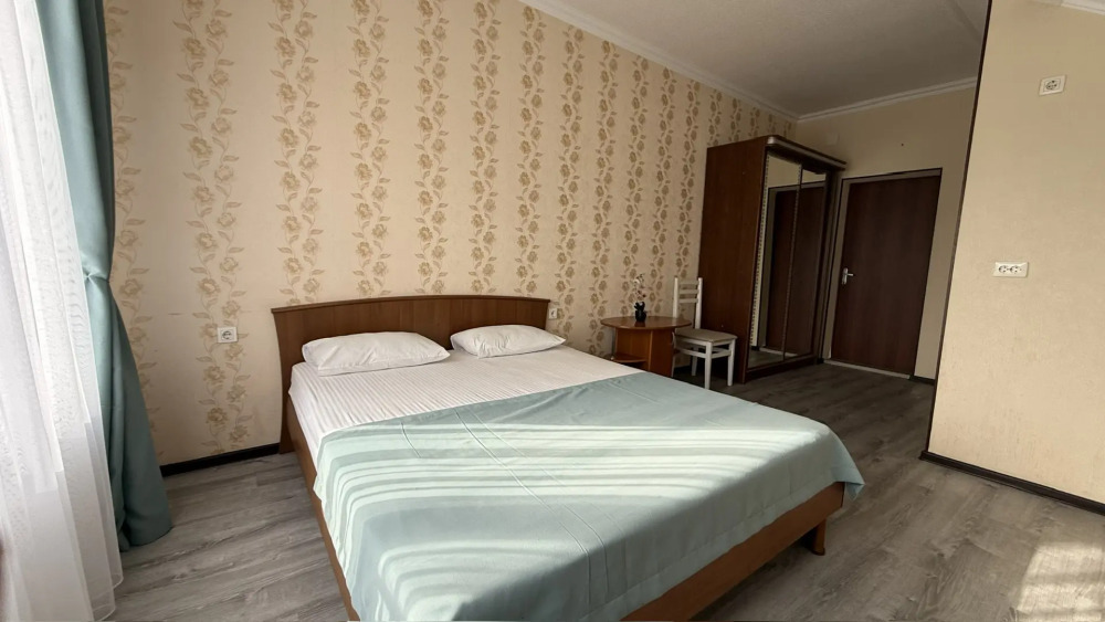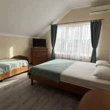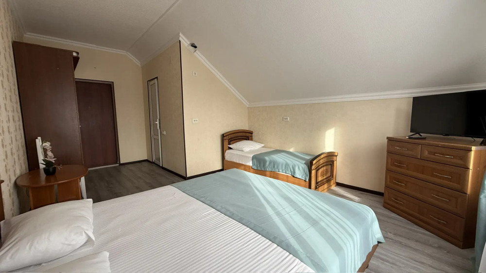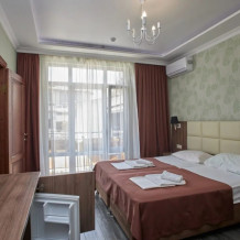 Светлый, уютный номер меблирован шкафом для одежды, тумбочками, кухонным столом, стульями. Для гостей имеется плазменный телевизор и кондиционер. Так же для удобства гостей имеется кухня с холодильником, электроплитой, чайником, необходимым набором посуды. Собственная ванная комната оснащена душем и туалетными принадлежностями.