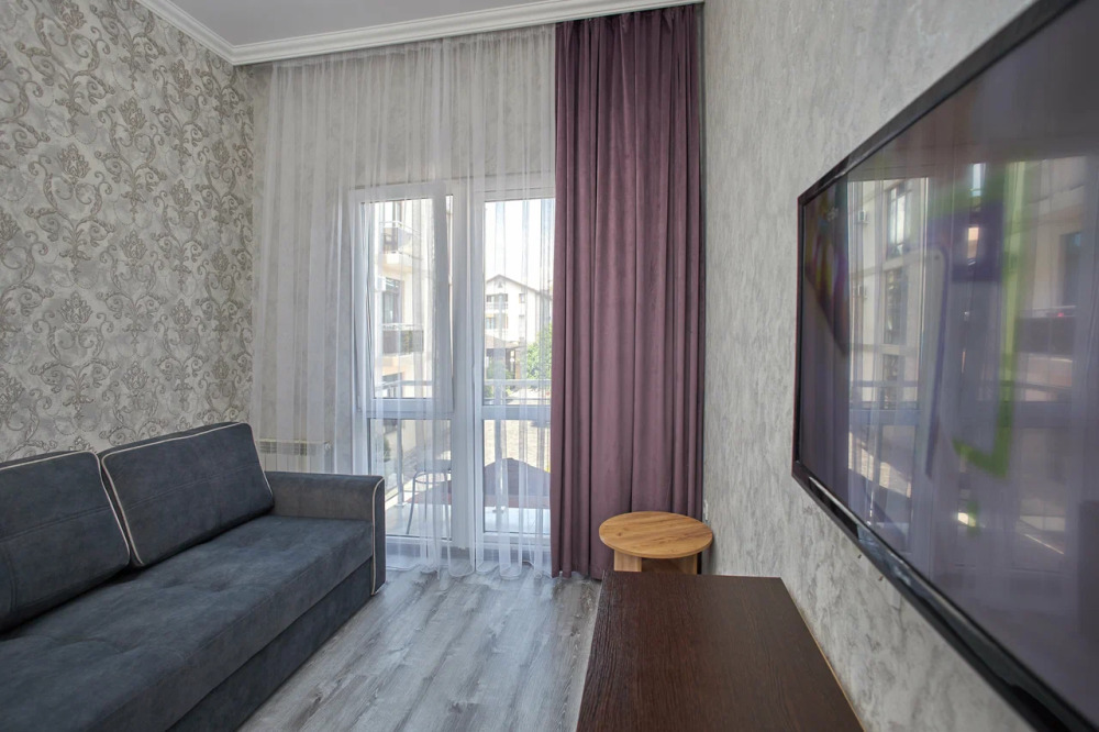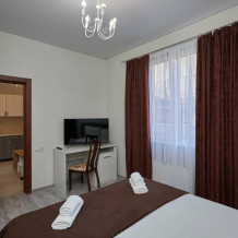 Двухкомнатный семейный номер, оформлен в классическом стиле. В номере имеется все необходимое для удобного время препровождения, включая удобную мебель двуспальную кровать или две раздельные кровати в одной спальне и диван кровать в гостинной, 2 кондиционера, 2 телевизора , холодильник, Wi-Fi, полотенца. Собственная ванная комната.