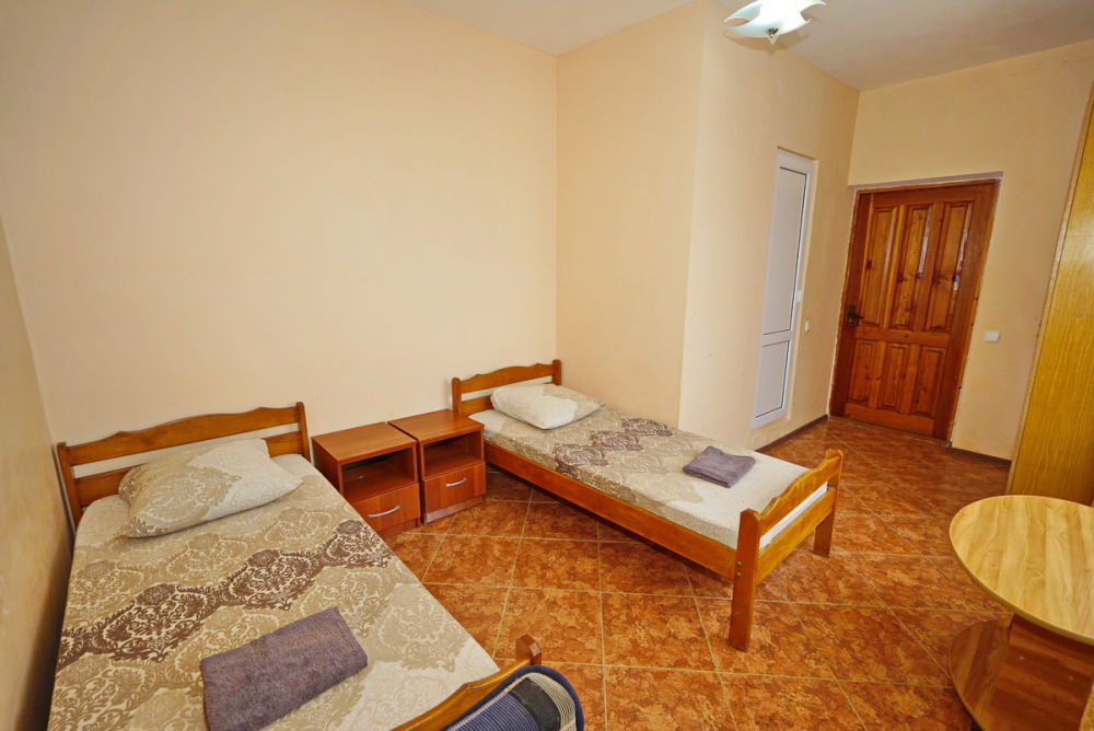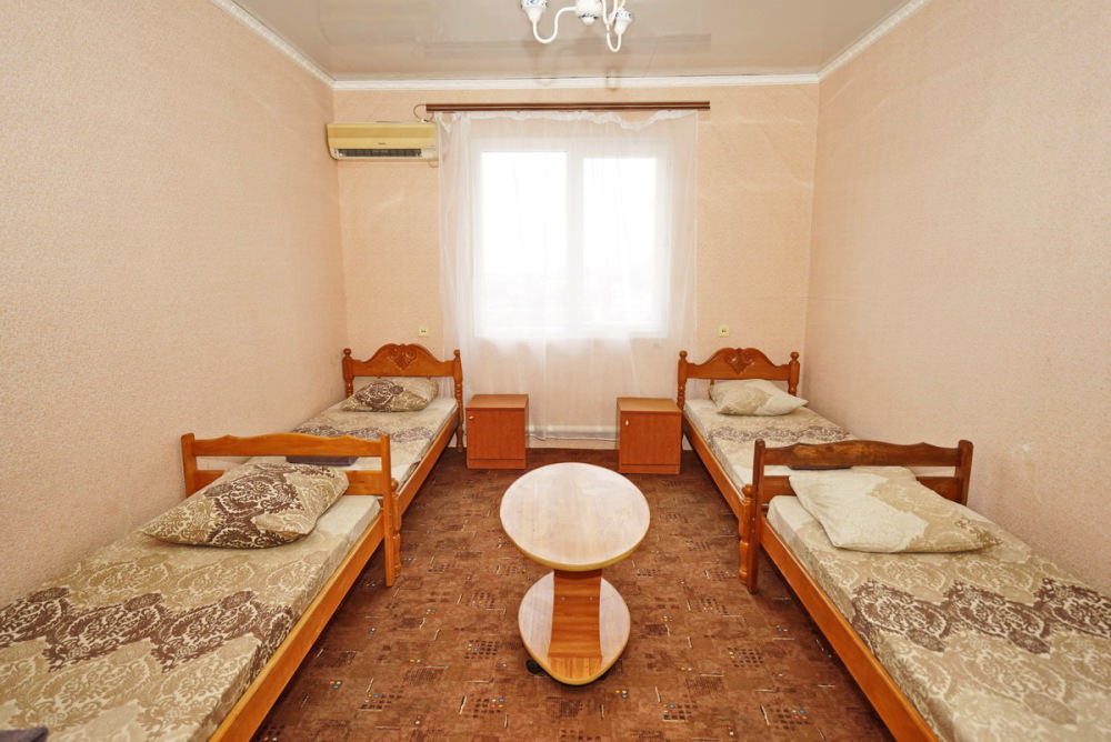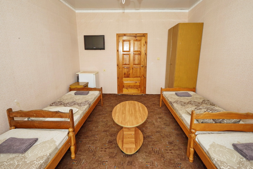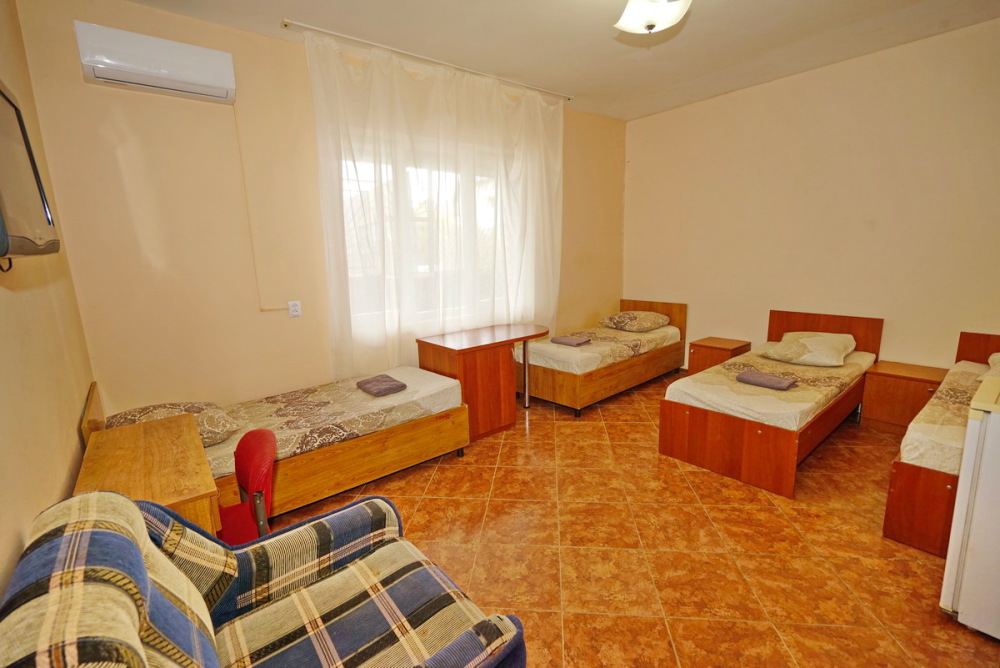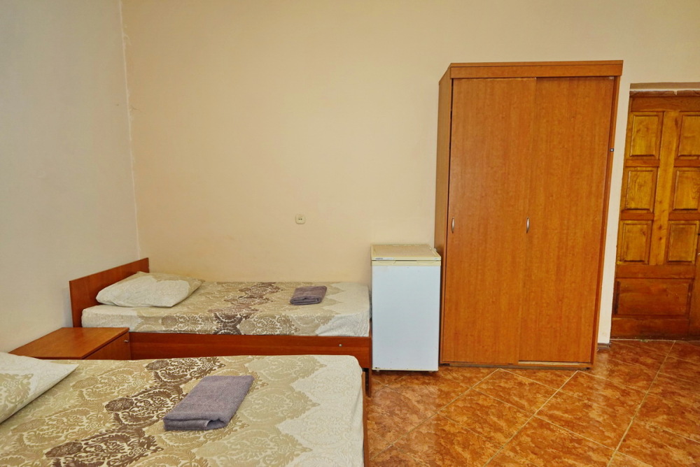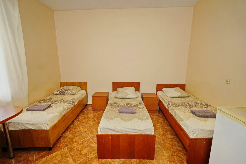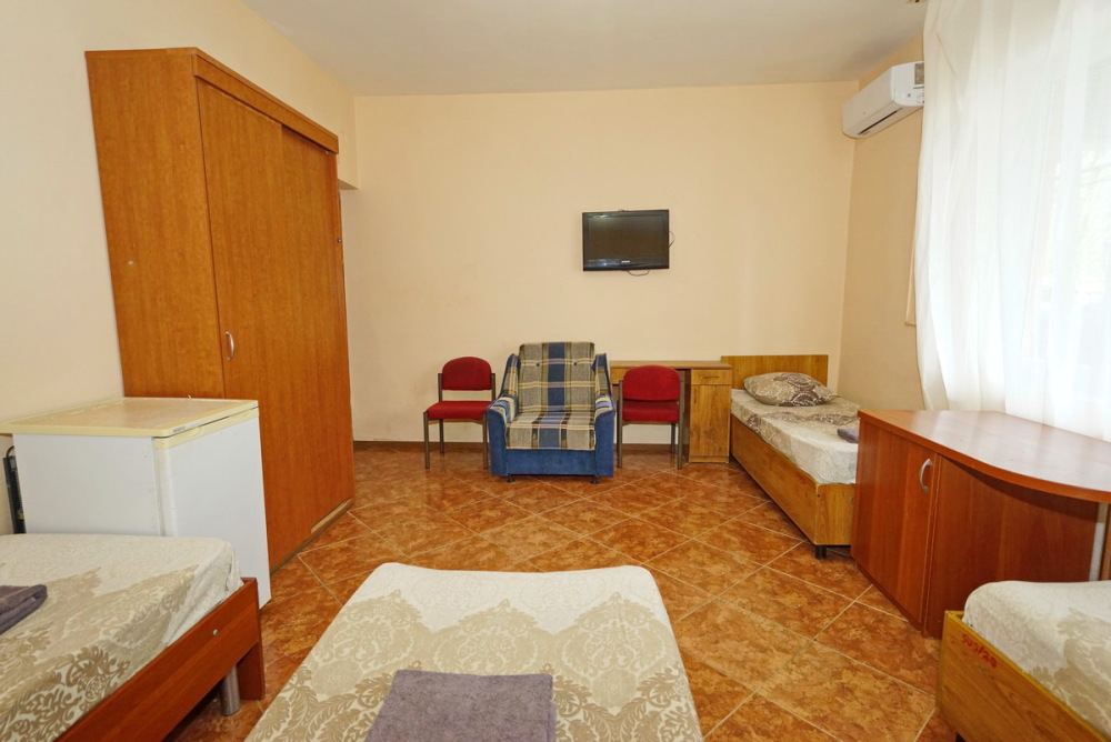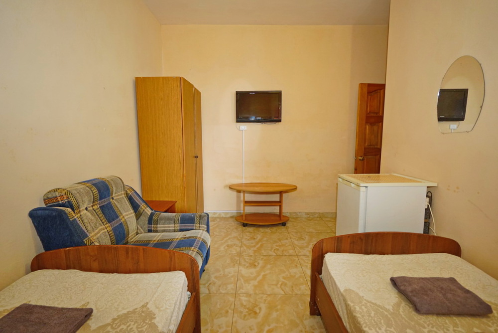Номер оснащен всем необходимым: шкаф, стулья, тумбочки, вешалка. Размещение на односпальных кроватях или двуспальной кровати и две односпальные. В номере есть телевизор с цифровым ТВ, холодильник и кондиционер. Душ и санузел общие, расположены на этаже.