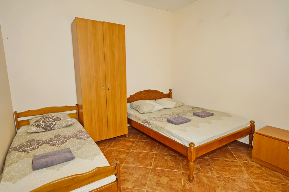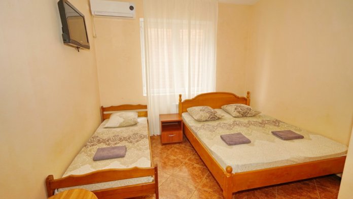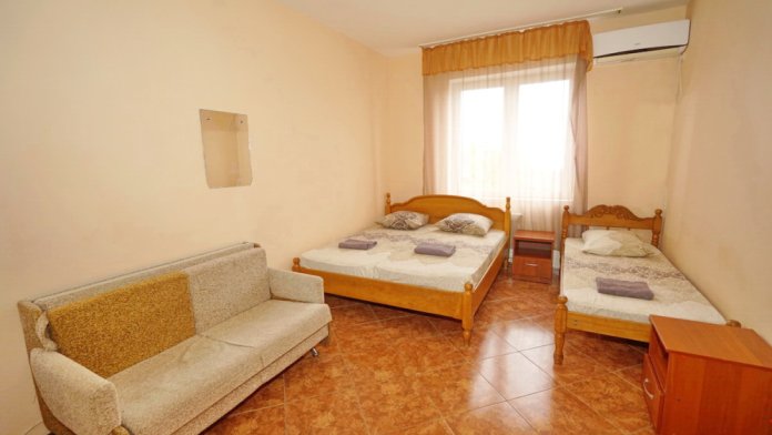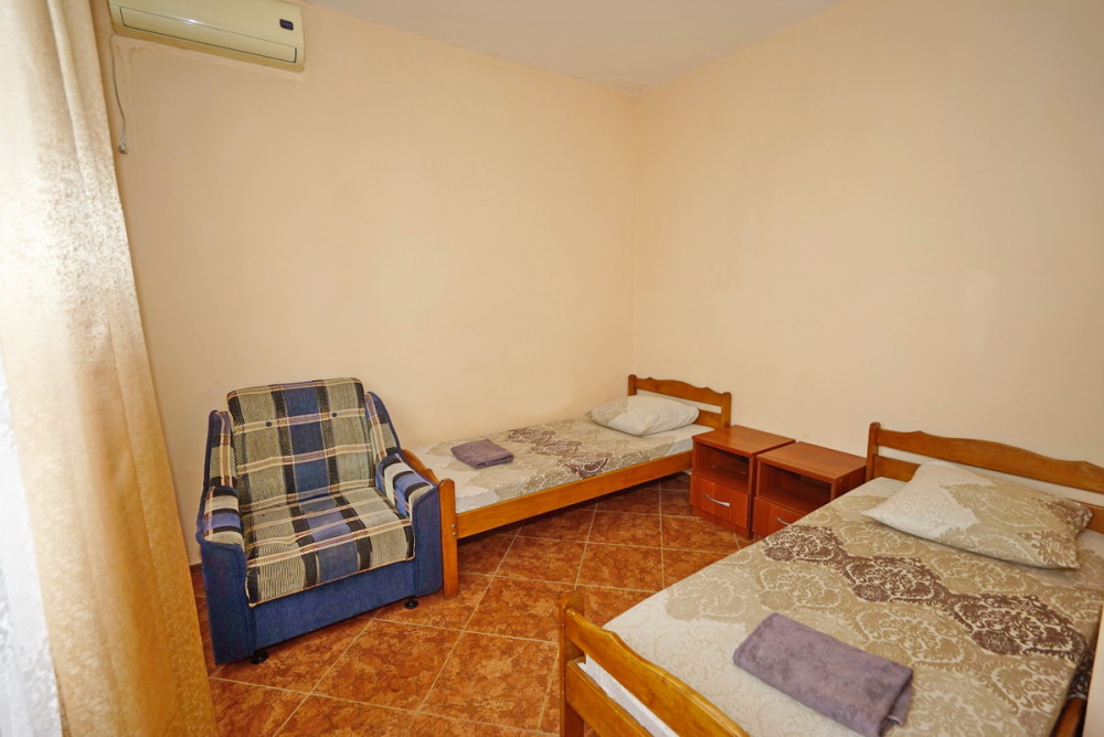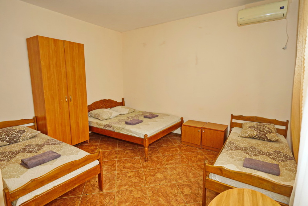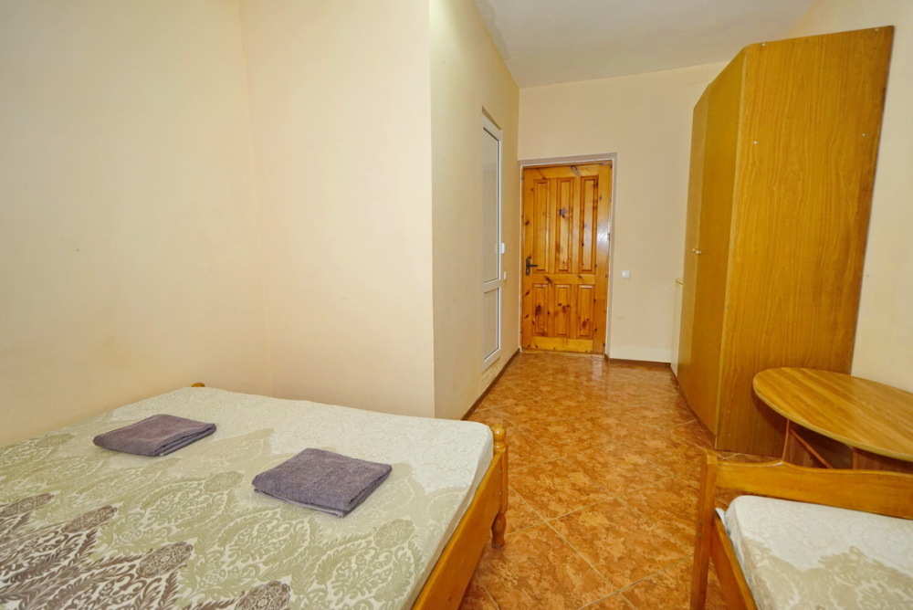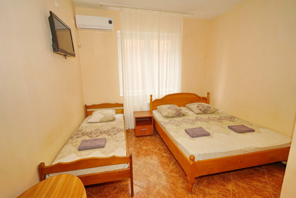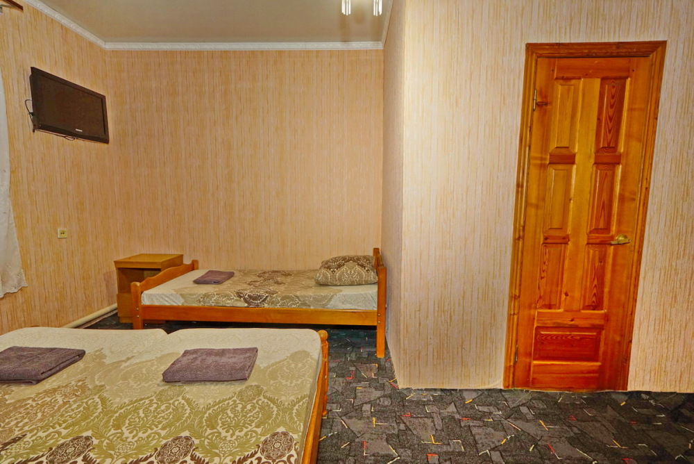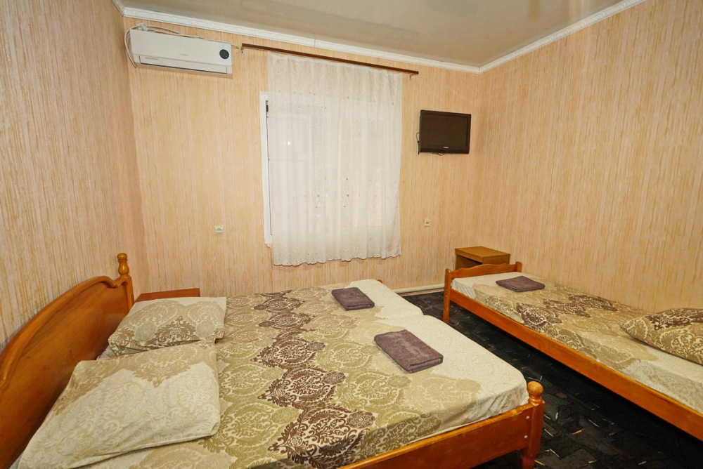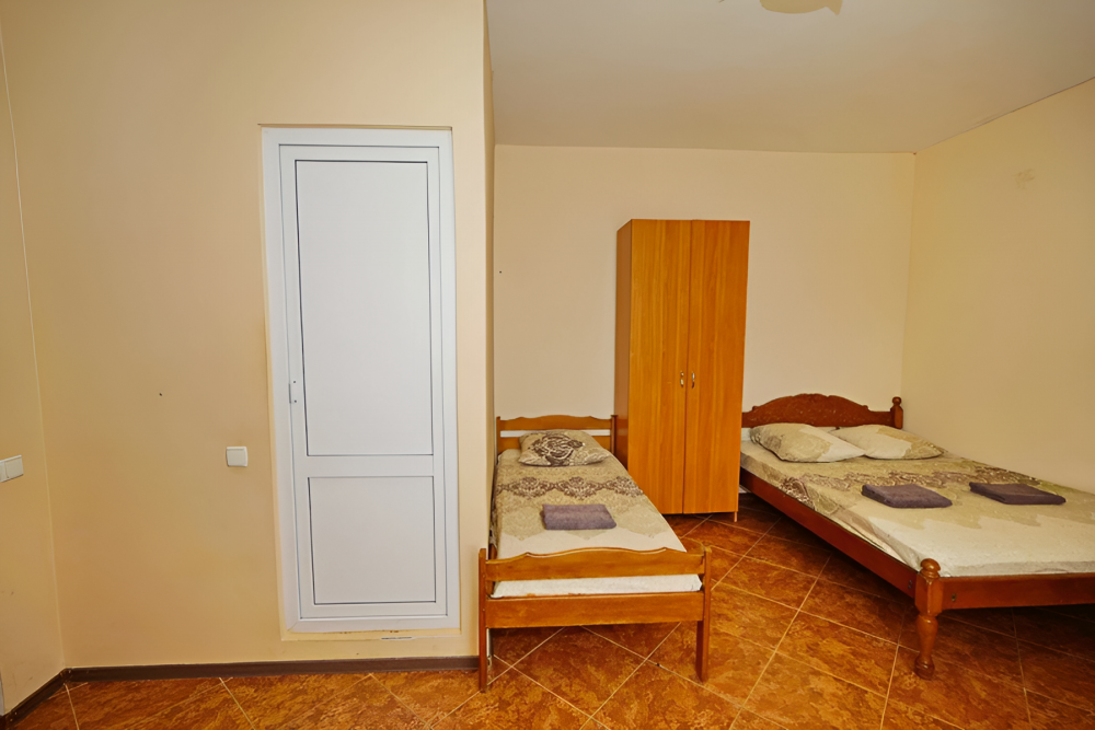 Номер оснащен всем необходимым: шкаф, стулья, тумбочки, вешалка. Размещение на односпальных кроватях или двуспальной кровати и две односпальные. В номере есть телевизор с цифровым ТВ, холодильник и кондиционер. Душ и санузел общие, расположены на этаже.