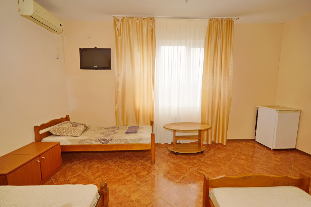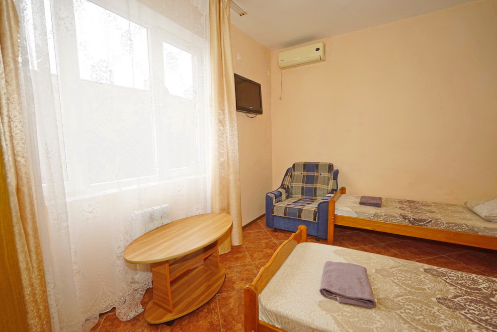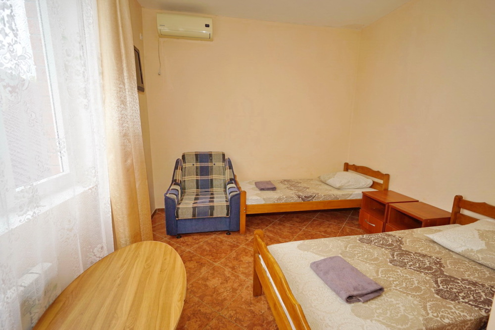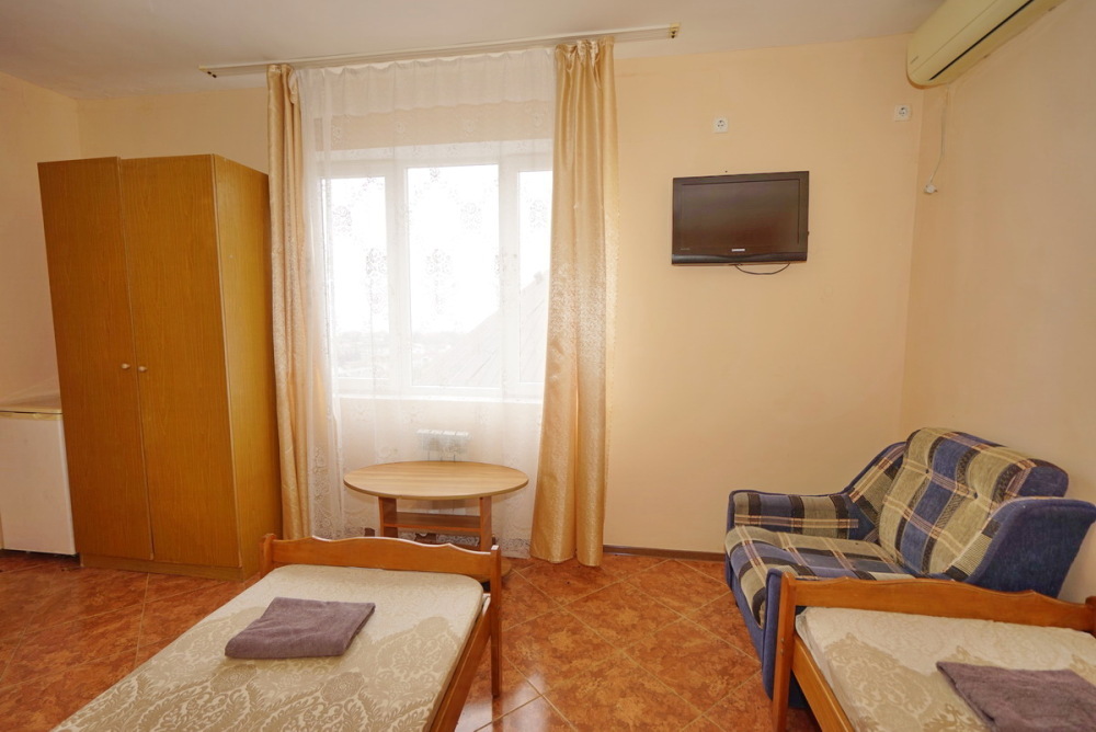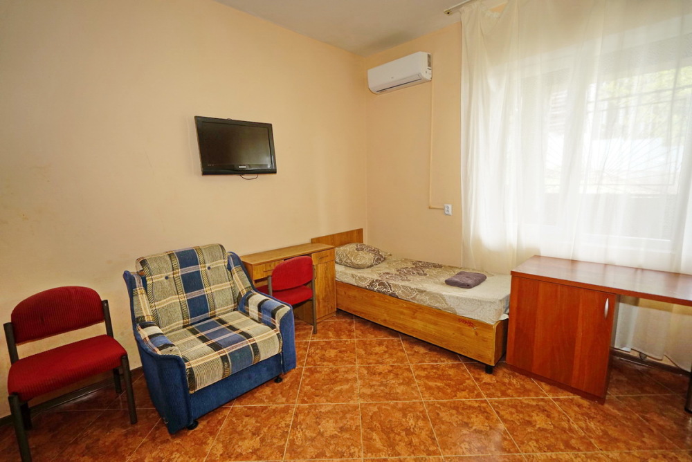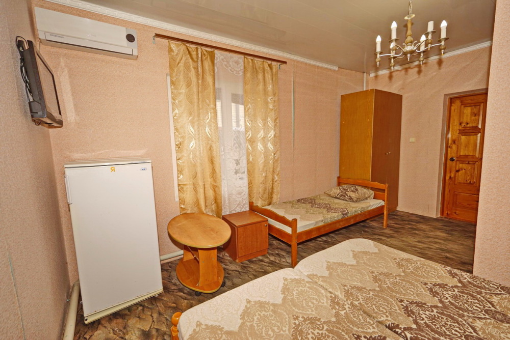 Комфортабельный номер с удобствами: шкаф, стулья, тумбочки, вешалка. Возможно размещение на односпальных или двуспальной кровати. В номере установлены телевизор с цифровым ТВ, холодильник, кондиционер. Душ и санузел — в номере.