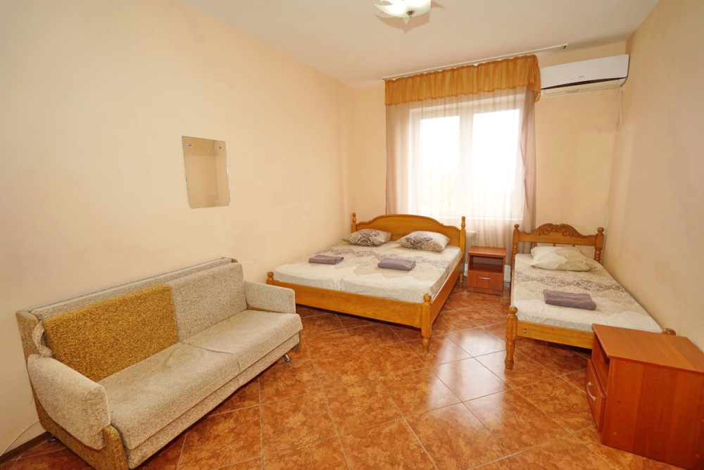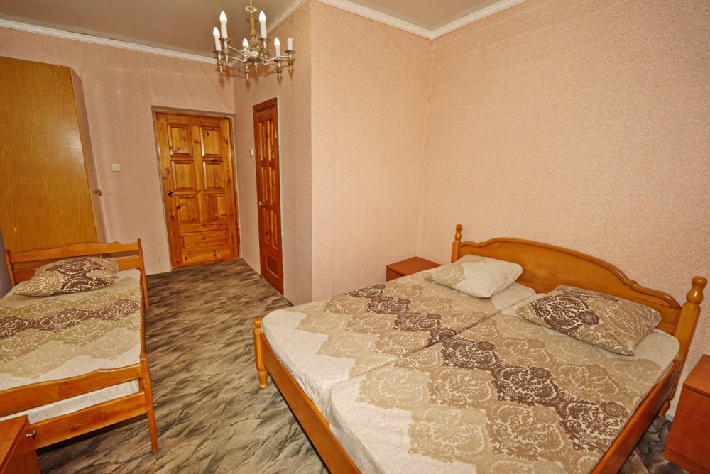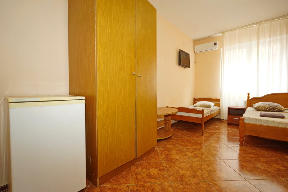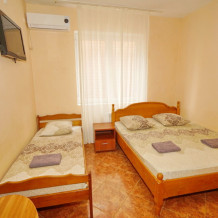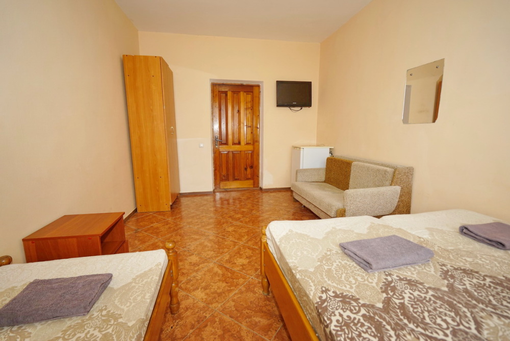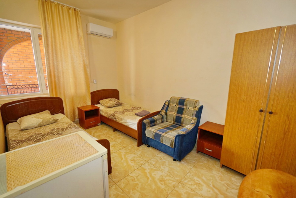 Комфортабельный номер с удобствами: шкаф, стулья, тумбочки, вешалка. Возможно размещение на односпальных или двуспальной кровати. В номере установлены телевизор с цифровым ТВ, холодильник, кондиционер. Душ и санузел — в номере.