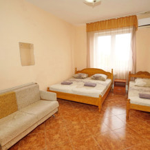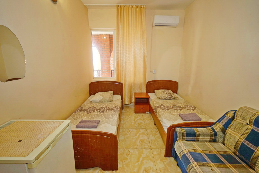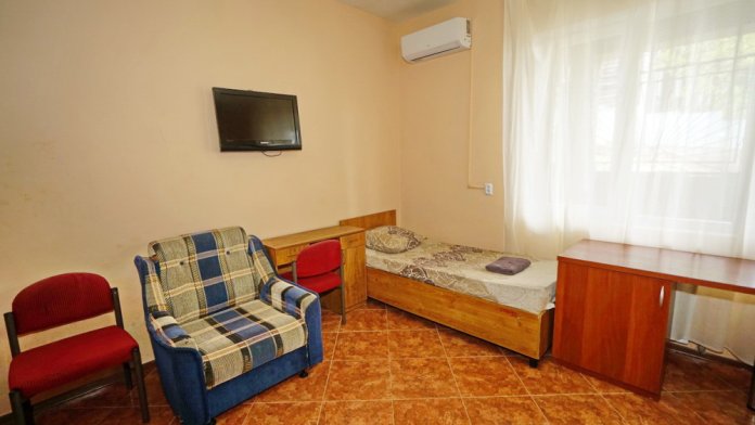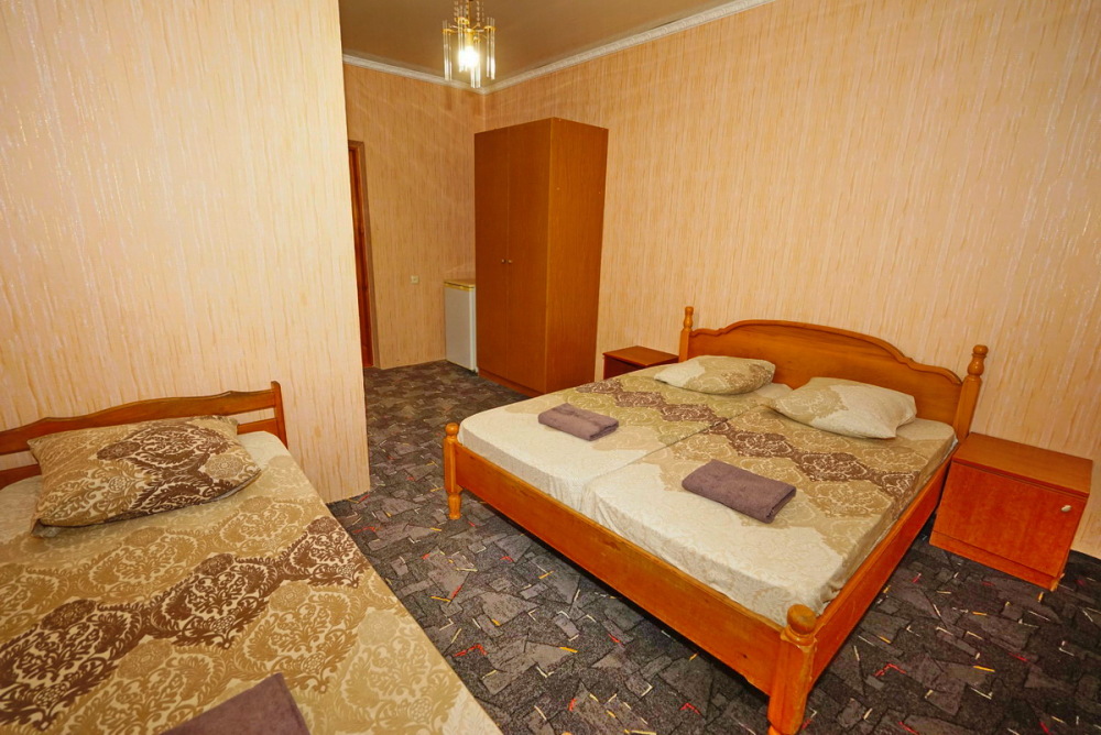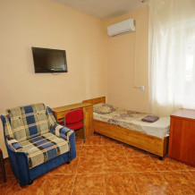 Номер оснащен всем необходимым: шкаф, стулья, тумбочки, вешалка. Размещение на односпальных кроватях или двуспальной кровати и односпальная кровать и кресло-кровать. В номере есть телевизор с цифровым ТВ, холодильник и кондиционер. Душ и санузел общие, расположены на этаже.