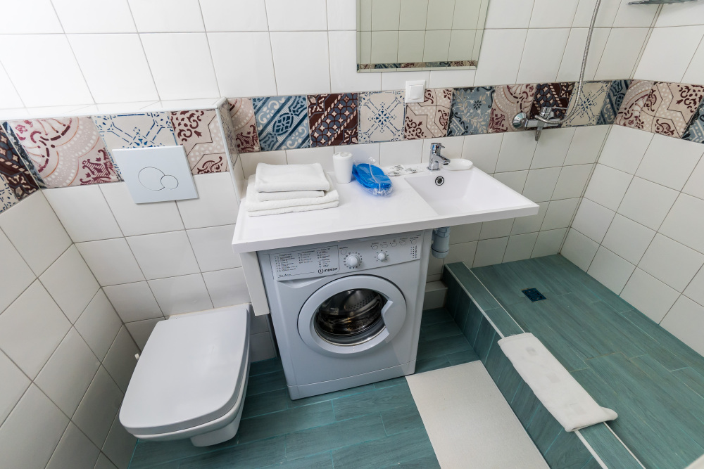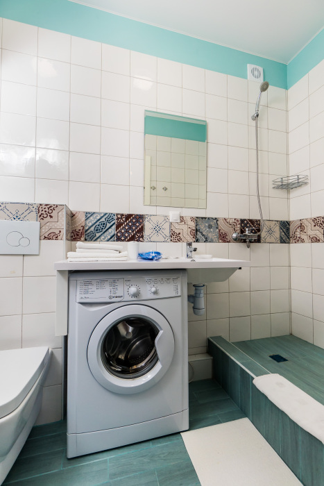 - Ванная комната площадью 4 м2 с ванной, раковиной, зеркалом, стиральной машиной, полотенцесушителем, крючками для одежды, унитазом, водонагревателем.