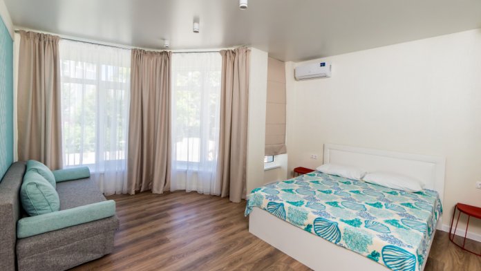 - Комната с кухней площадью 18 м2 Укомплектована кухонным гарнитуром со встроенной электроплитой, холодильником (высотой 85см), СВЧ- печью, электрочайником, набором посуды для приготовления и употребления пищи на 5 человек, обеденным столом со стульями, двуспальным раскладным диваном (шириной 160см), сплит-системой. В кухне так же стоит раскладное кресло.
