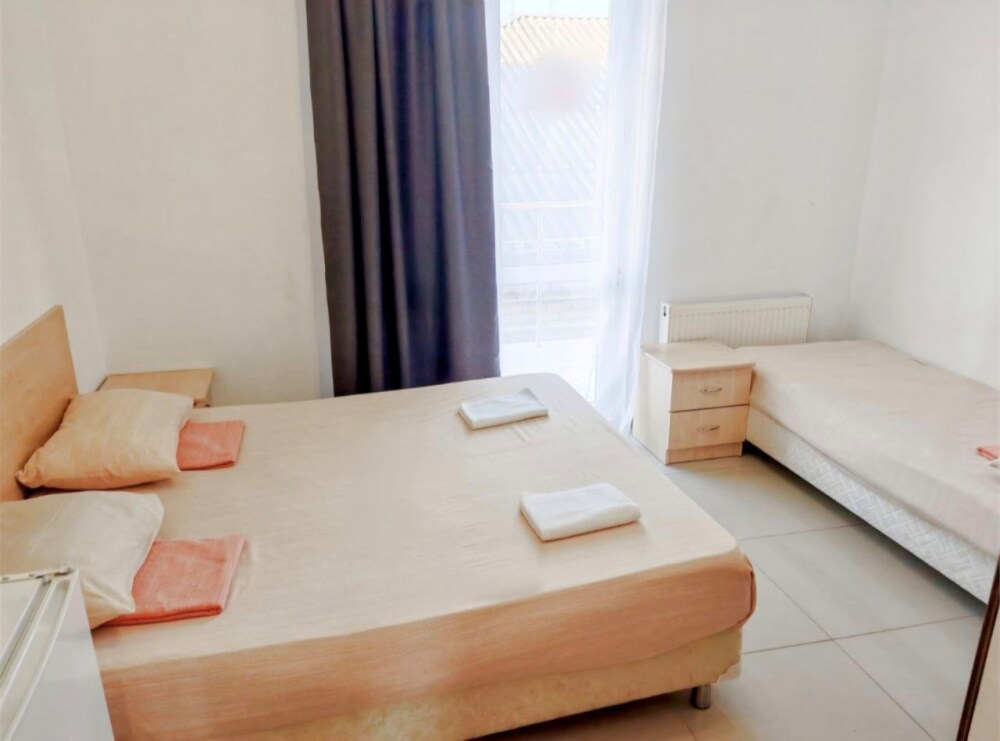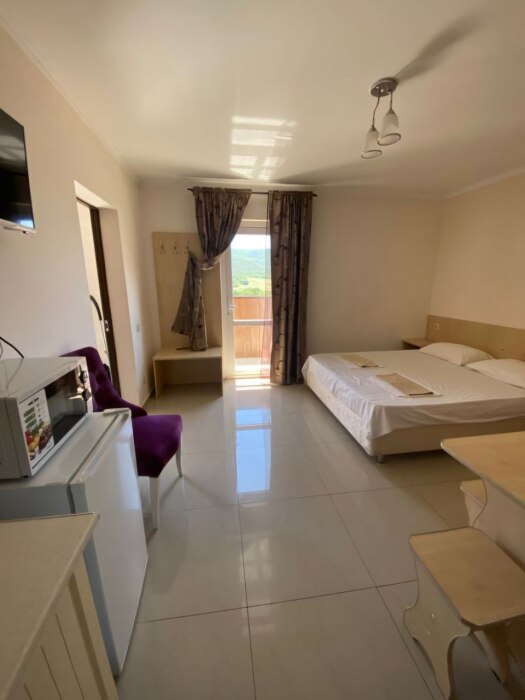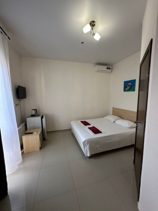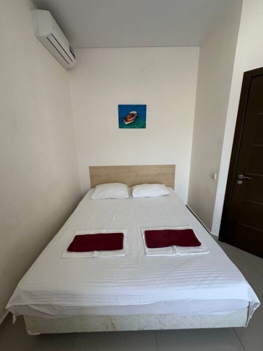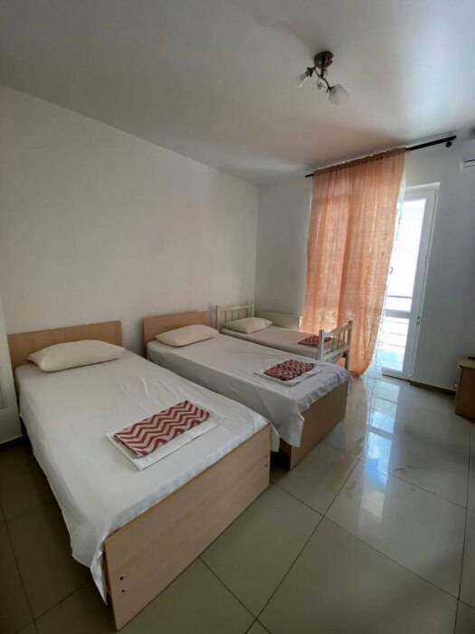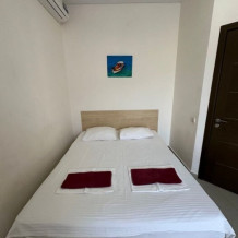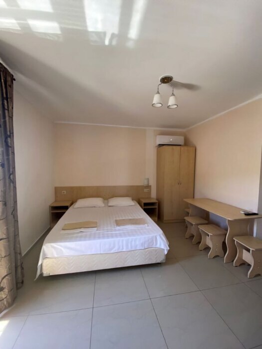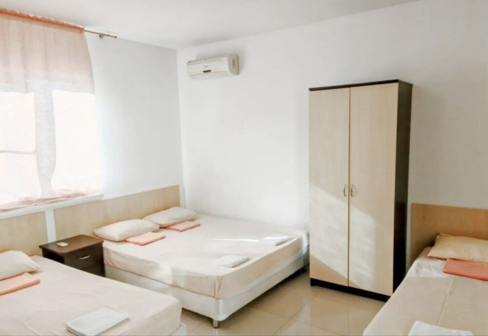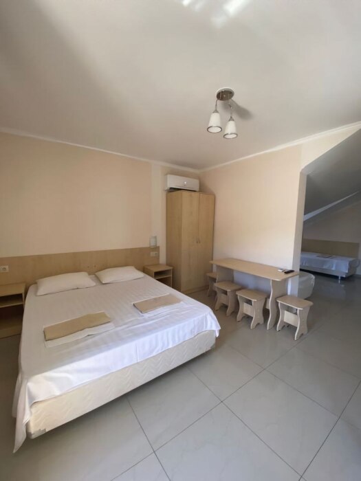 В номере — одна двуспальная кровать и 2 односпальных, холодильник, сплит-система, телевизор, ванная комната с душевой кабиной, своя кухонная зона. Номера расположены на 2 и 3 этаже.