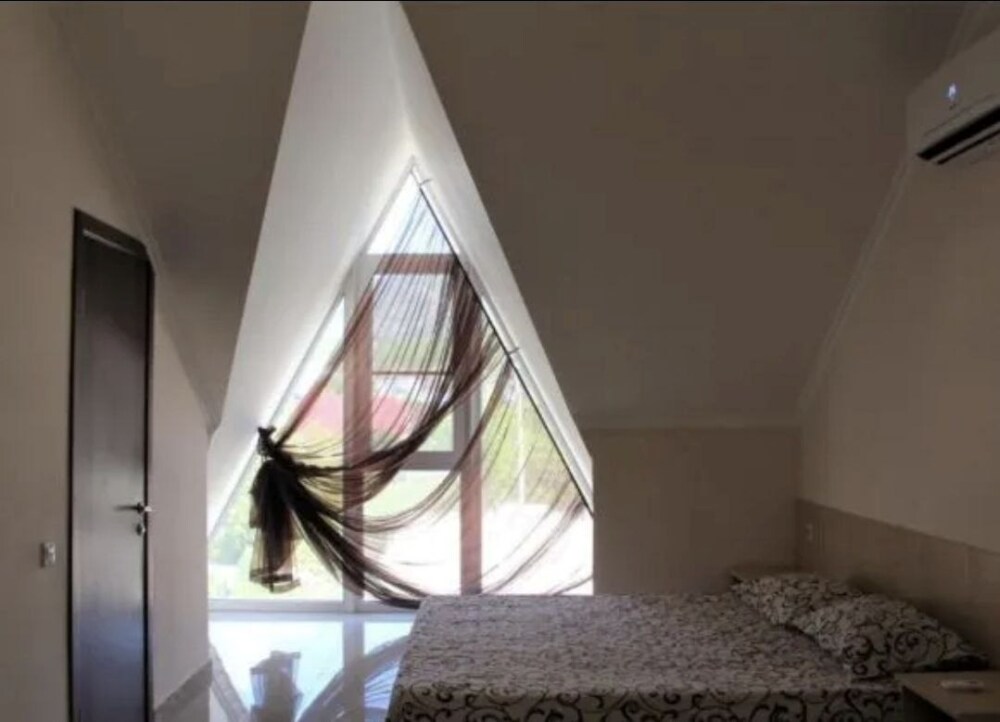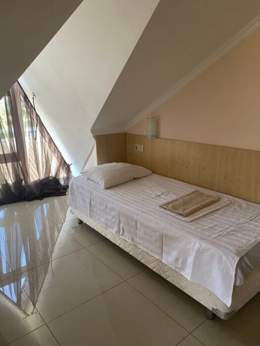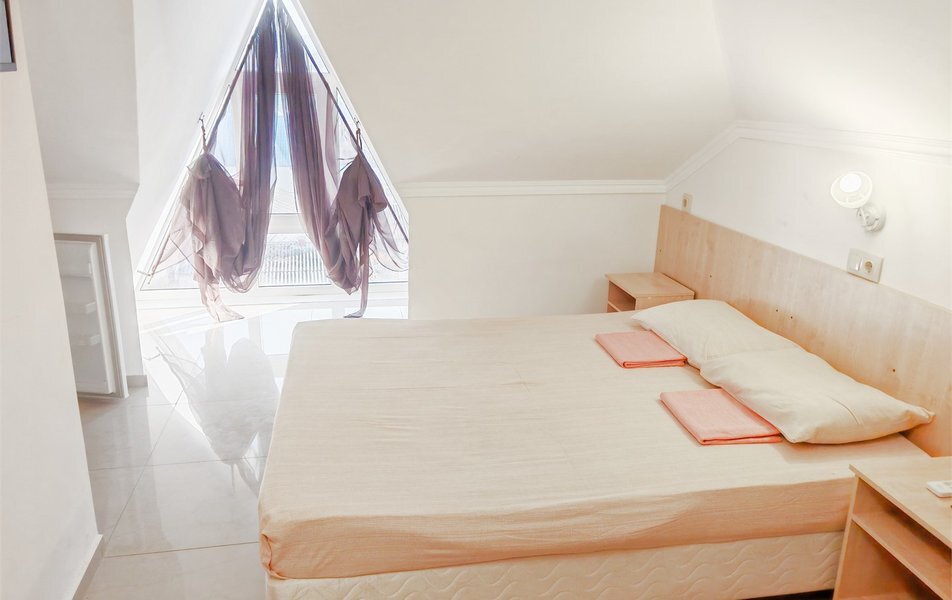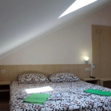 Уютный номер для двоих, подходит для одноместного или двухместного размещения, располагается на мансардные этаже. В номере — одна двуспальная кровать, мини-холодильник, сплит-система, телевизор, ванна