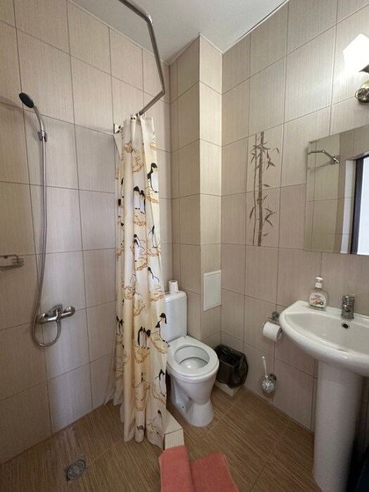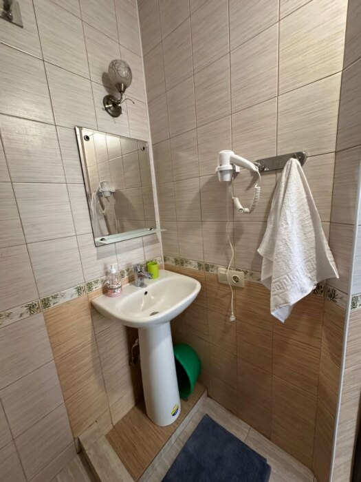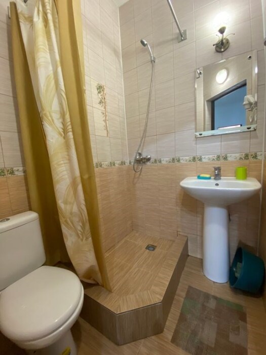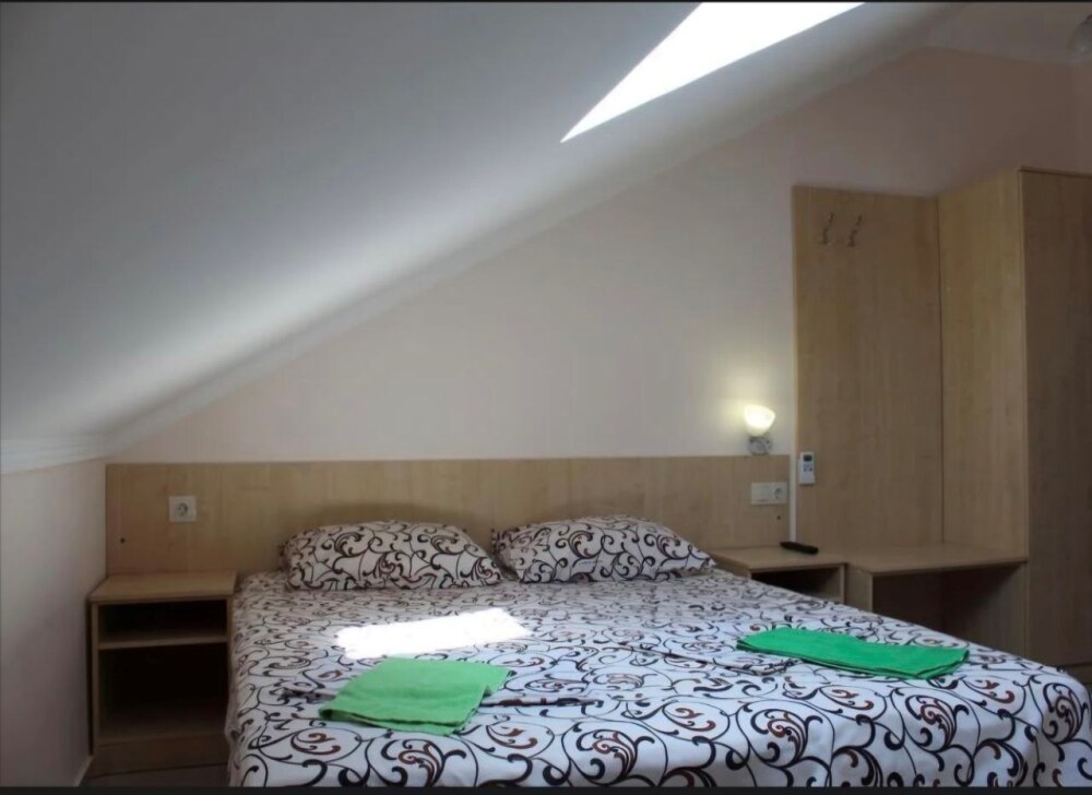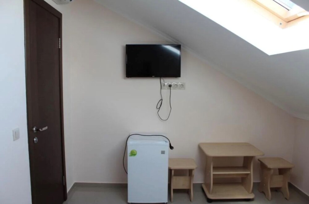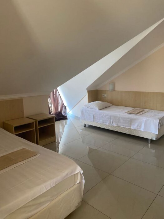 В номер — одна двуспальная кровать и 2 односпальных, холодильник, сплит-система, телевизор, ванная комната с душевой кабиной, своя кухонная зона.Номер расположен на 4 этаже, мансарда.