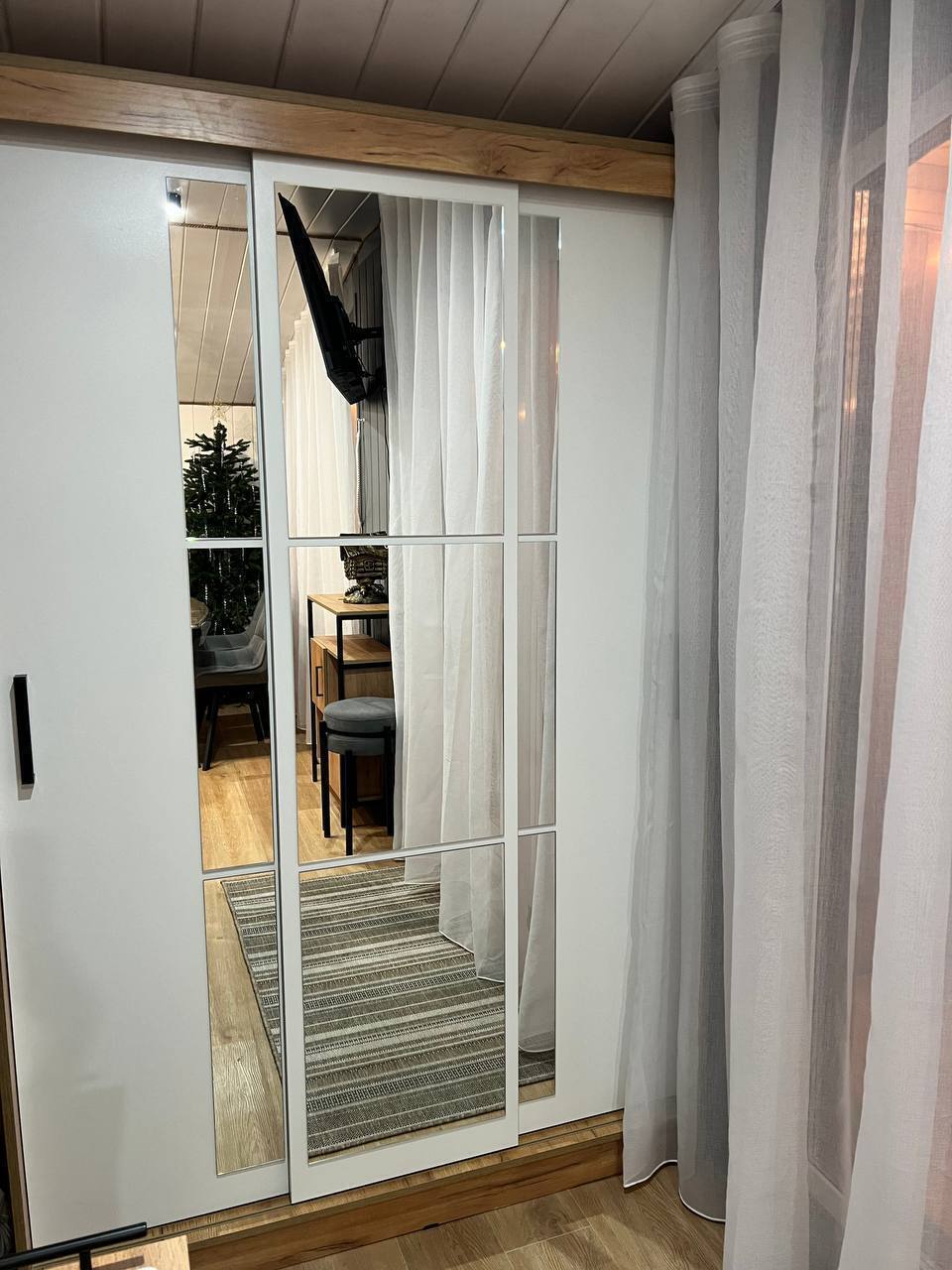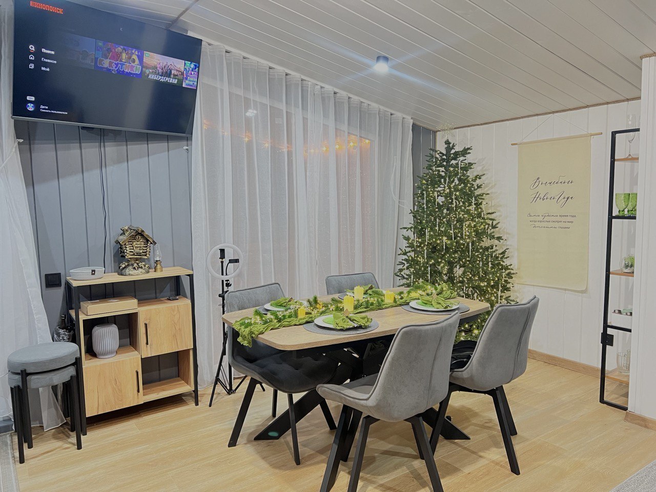 - Кухня-гостиная с панорамными окнами с красивым видом, с диваном-кроватью 150х200, большим раздвижным столом, комфортабельными стульями и теплым полом;