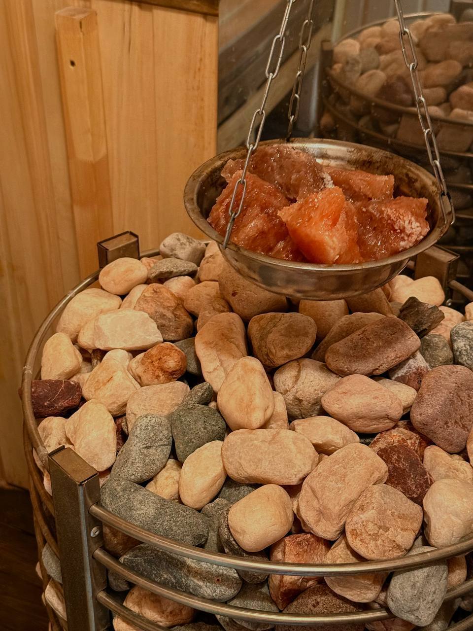 Отделанная липой парная с двухъярусным полоком для парения: верхний настил 180х80, нижний – 180х40. Баня оборудована электрокаменкой с эффектом русской бани. Загружено 150 кг полудрагоценных камней: кварц, кварц лунный, яшма, жадеит, змеевик. Имеющийся пульт предназначен для простого управления, регуляции температуры в бане, задержки включения и времени работы печи. Туалет, душ.