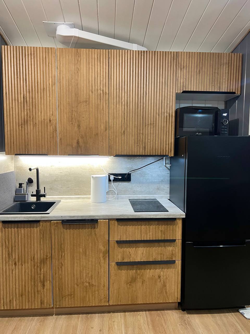 В нашем доме комфортабельная кухня для самостоятельного приготовления пищи. Варочная панель с вытяжкой, микроволновая печь и холодильник. Заказать готовую еду из ресторанов или продукты питания можно, например, в Деливери Клаб (заказ рекомендуем делать заблаговременно). Возможно заказать доставку раков (сырых и готовых) – по договоренности.