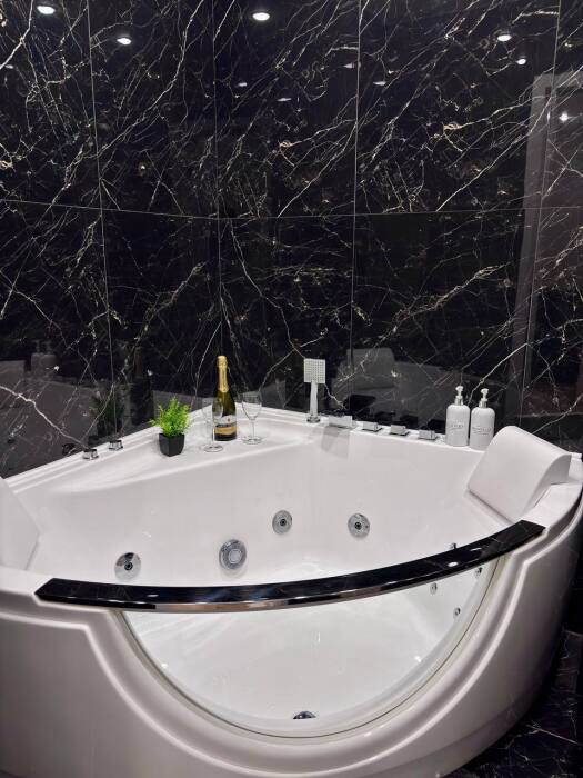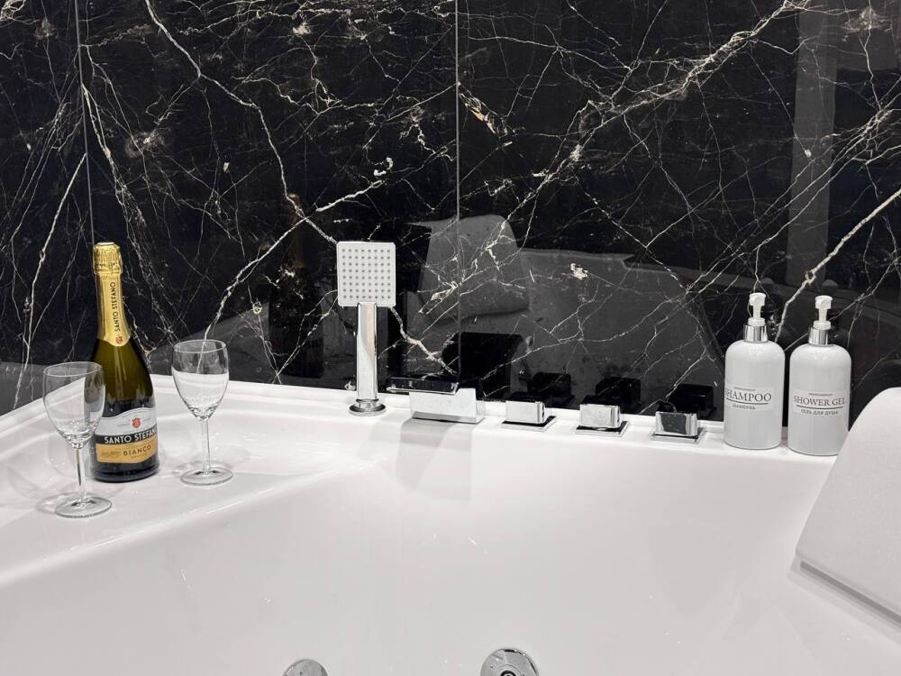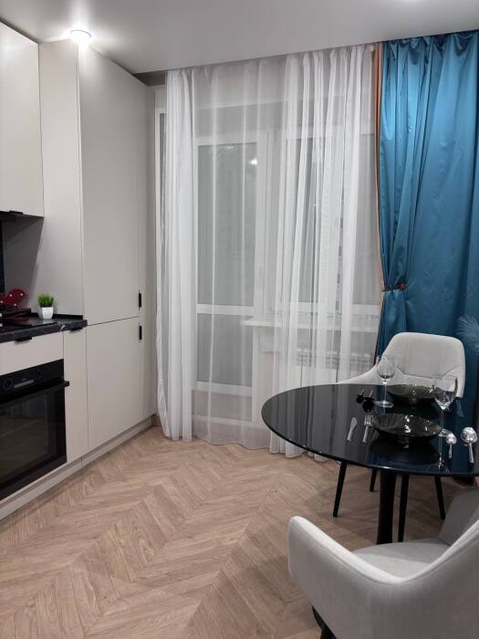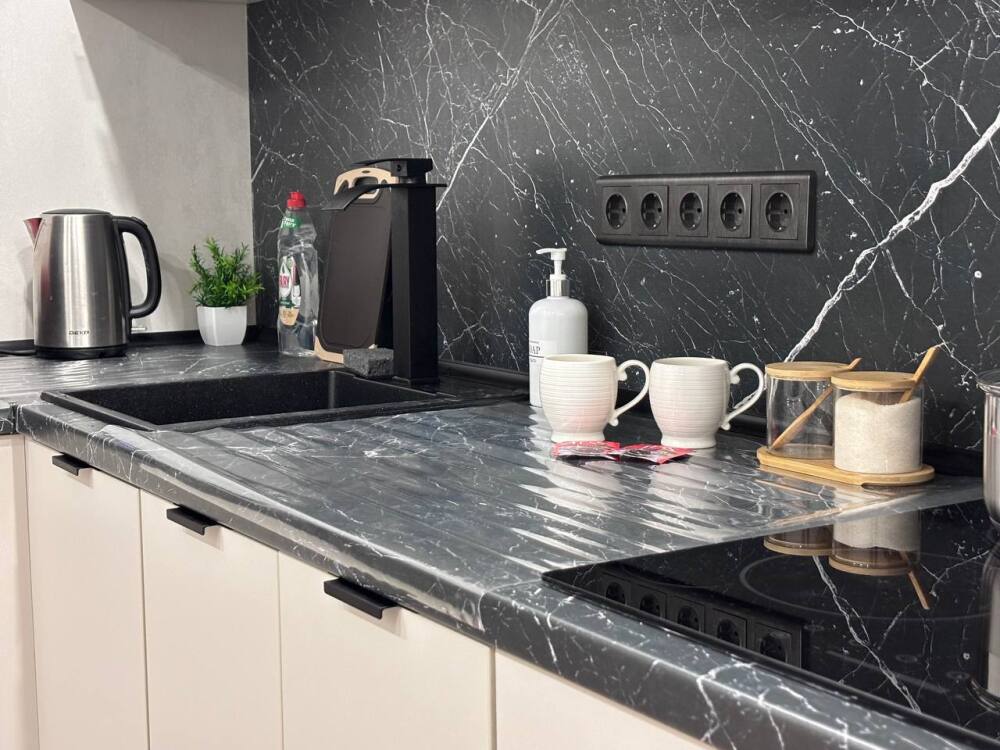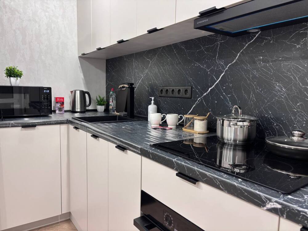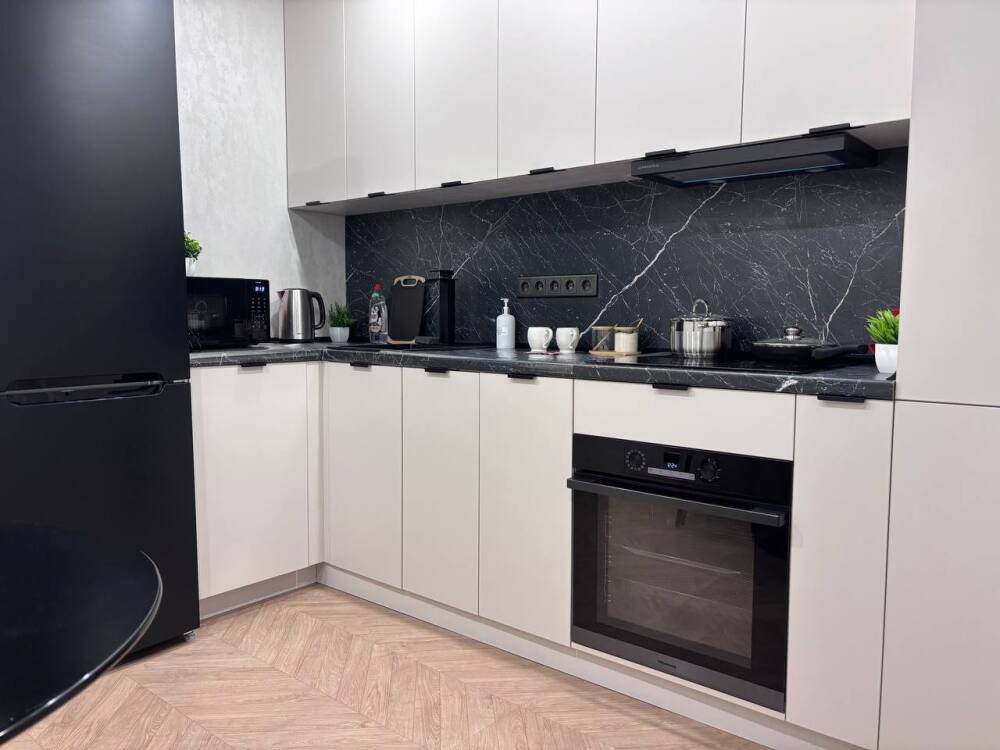 - Полностью оборудованная кухня (холодильник, варочная панель, духовой шкаф, вытяжка, микроволновая печь, электрический чайник)
