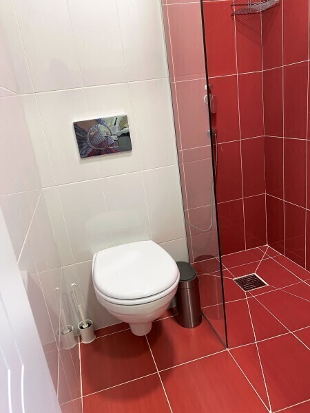 Собственный отдельный туалет с душем, кухня, телевизор, стиральная машина и гладильные принадлежности.