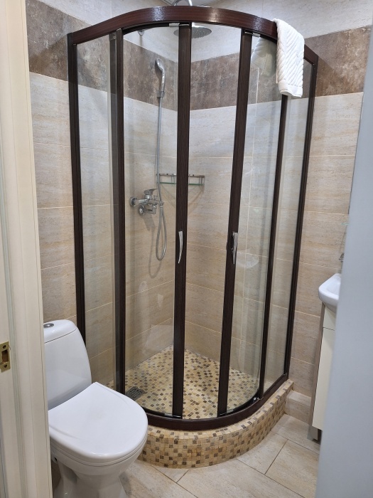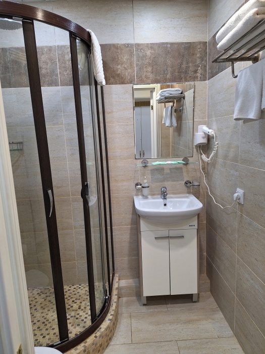 Гостям предоставляется халат и тапочки по запросу. Удобства все в номере