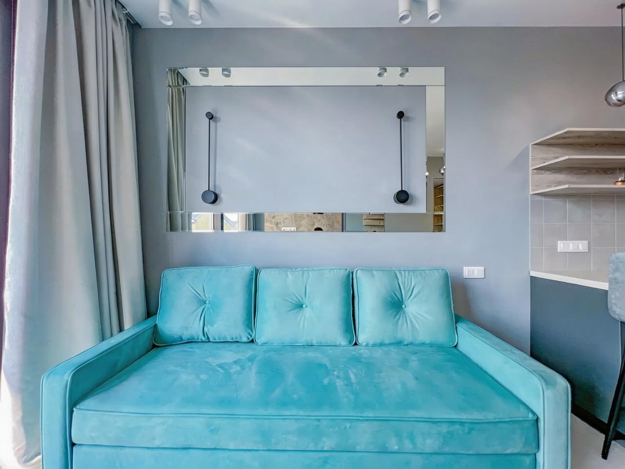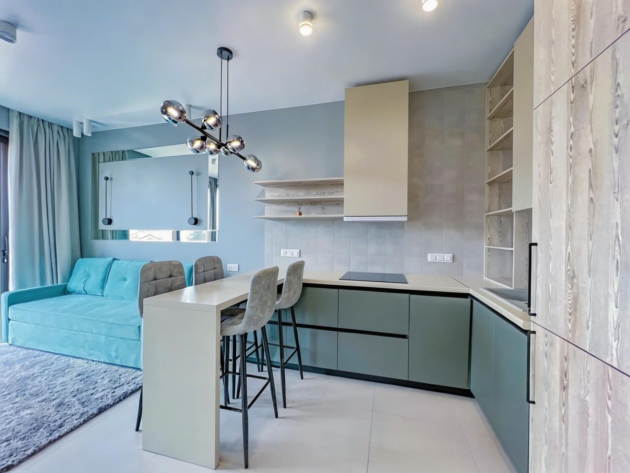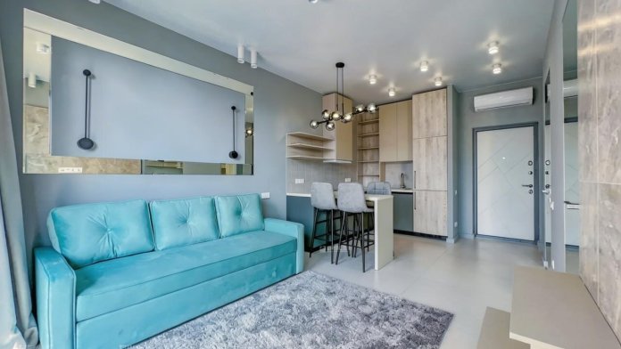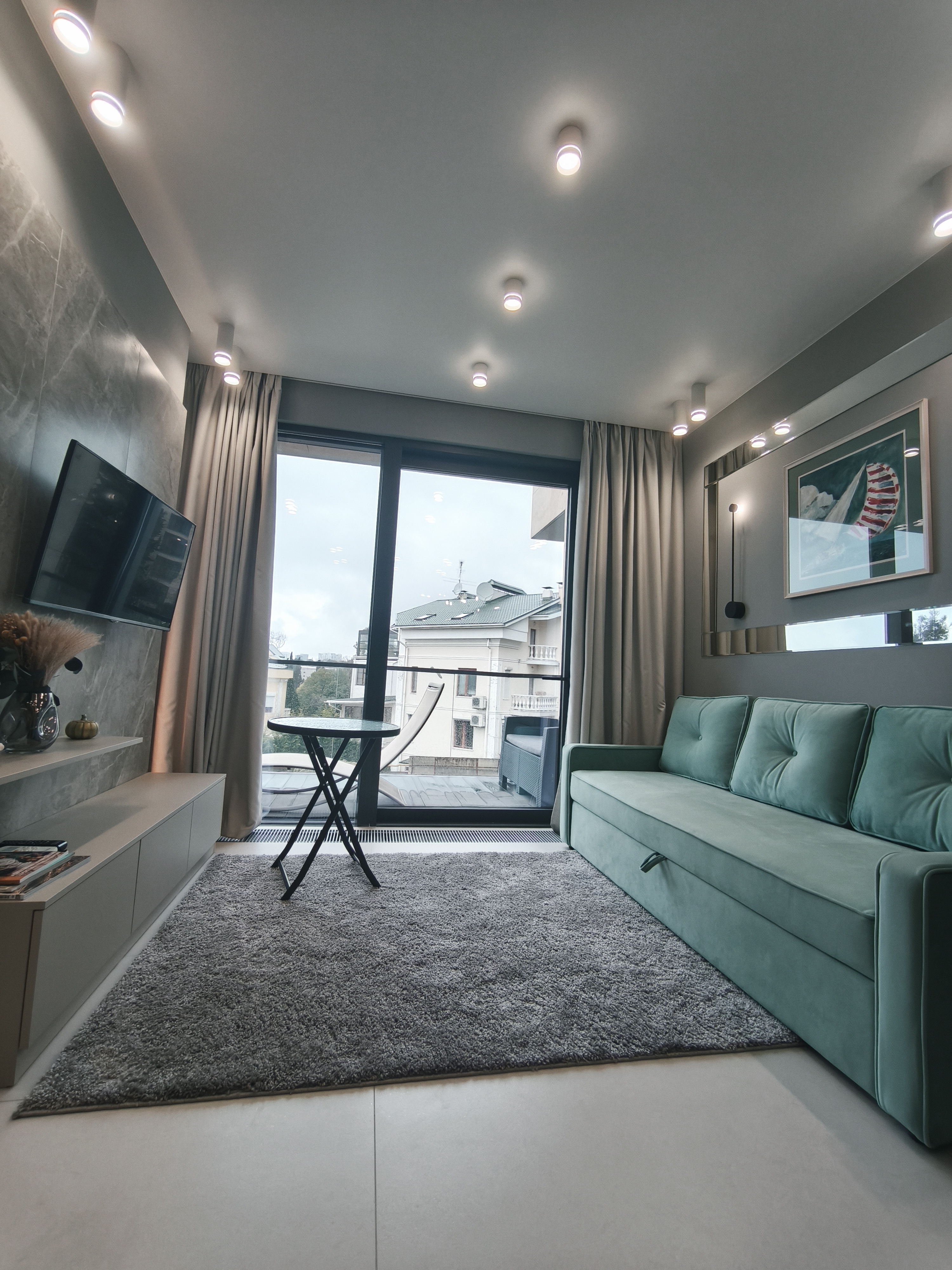 - Гостиная, совмещённая с кухней, сердце апартаментов. Просторная зона отдыха с элегантным раскладывающимся диваном (полноценное спальное место для двоих) идеальна для семейного отдыха или встреч с друзьями.