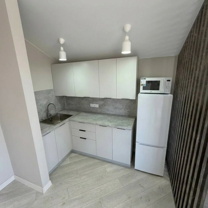 Кухня: электрическая плита, духовой шкаф, обеденный стол, посуда, СВЧ, холодильник.
