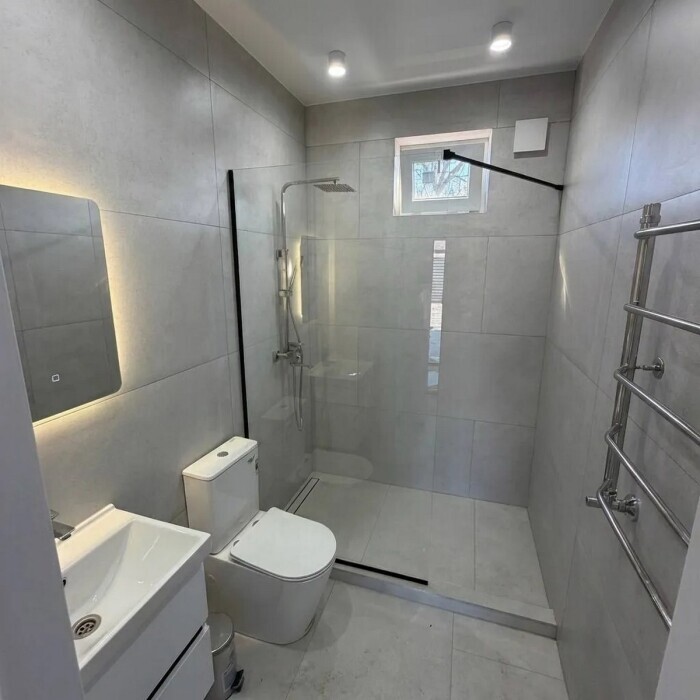 Индивидуальная ванная комната: душ, раковина, туалет.