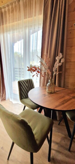 - Спальная комната с панорамными окнами, выходом на веранду и видом на лес;